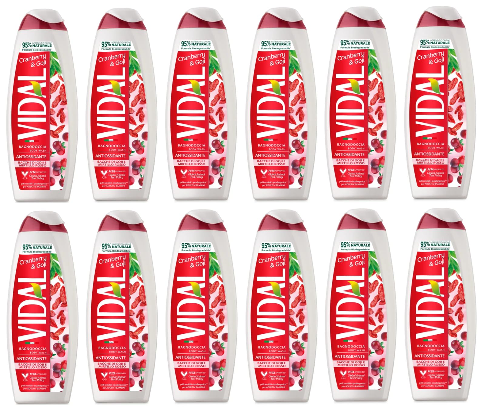 12 confezioni di detergente per il corpo Vidal Bagnodoccia, gel doccia Bacche di Goji e Mirtillo rosso, schiuma doccia con bacche di Goji e mirtillo, 500 ml