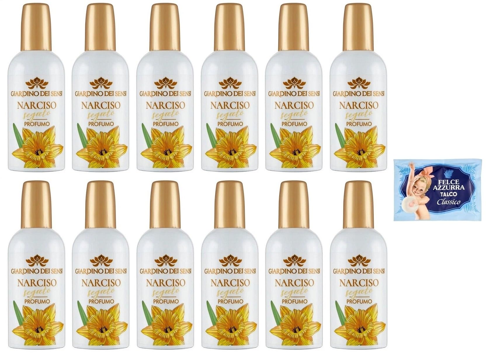 12 pezzi Giardino dei Sensi Profumo Narciso Segreto, profumo da donna, narciso segreto, 100 ml, confezione da 1 polvere di talco Felce Azzurra, sacchetto da 100 g