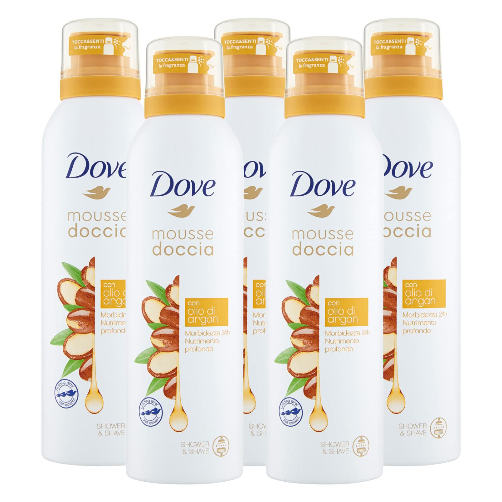 5x Dove Mousse Doccia Con Olio di Argan Morbidezza e Nutrimento 24h - 5 Flaconi da 200 ml