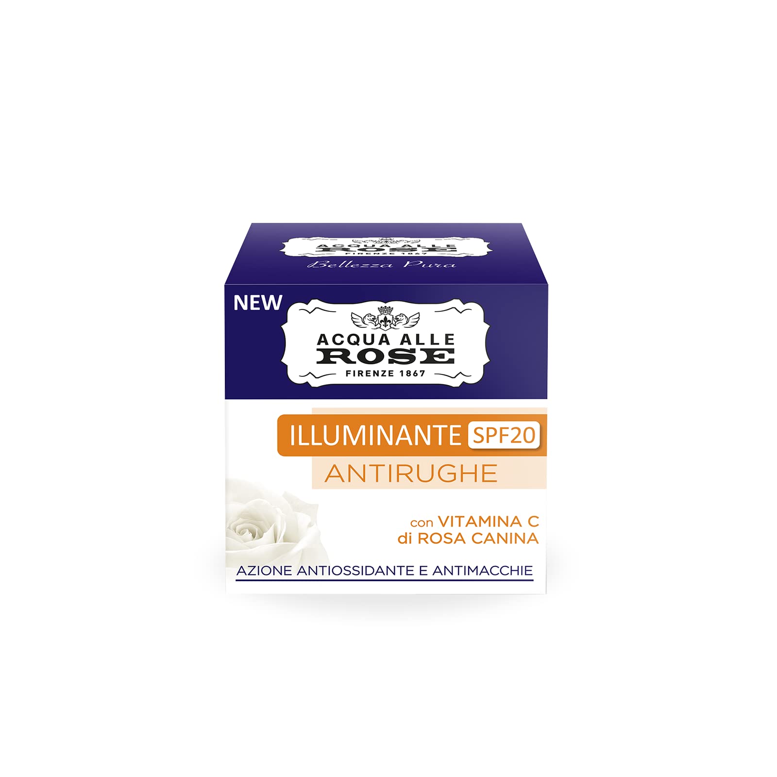 Acqua alle Rose, Crema Viso Illuminante Antirughe con Vitamina C di Rosa Canina e Vitamina C Micellare, Antirughe, Antimacchie, Antiossidante e Illuminante, SPF20, Pelle Elastica e Radiosa - 50 ml