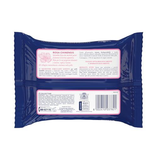 Acqua alle Rose, Salviettine Struccanti Lenitive per Pelli Sensibili, con Estratto di Rosa Chinensis con Azione Protettiva e Struccante sul Viso, Occhi e Labbra, 20 Salviettine