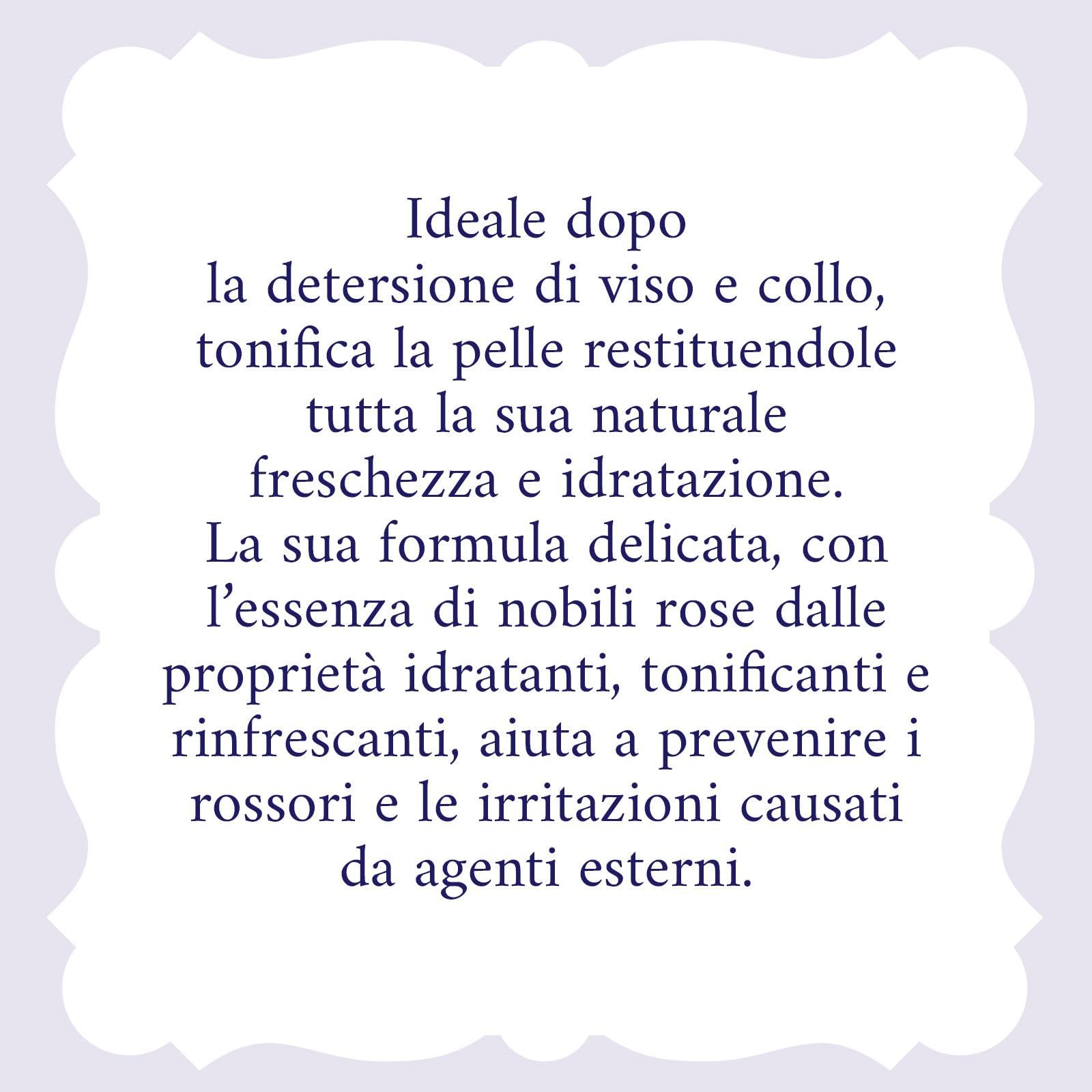 - FORMULA: Con Acqua Distillata di Rosa, che aiuta a ricaricare la pelle d'acqua ed estratti di Rose Nobili dalle proprietà idratanti, tonificanti, rinfrescanti