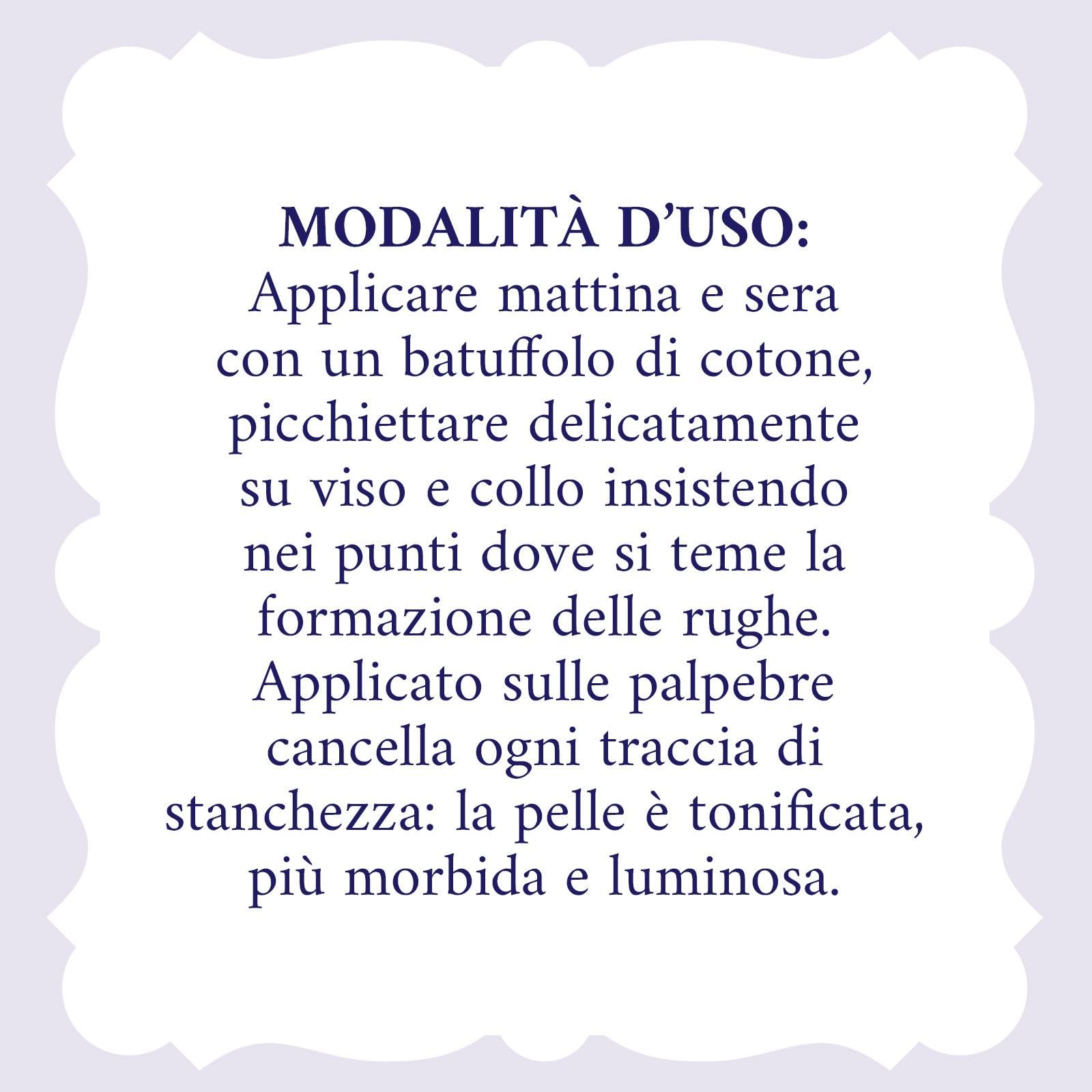 - MODO D'USO: Applicare mattina e sera con un batuffolo di cotone, picchiettare delicatamente su viso e collo insistendo nei punti dove si teme la formazione delle rughe
