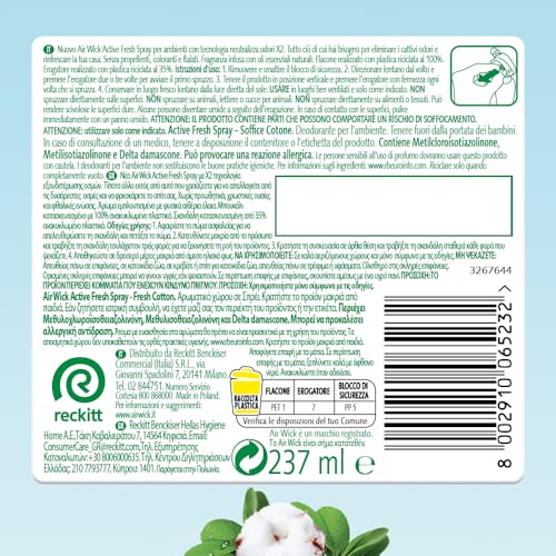 - CONFEZIONE: Contiene 8 Airwick Active Fresh Spray per ambienti da 237ml alla fragranza Fresco Cotone