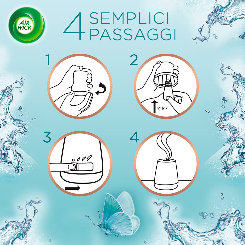 - LA CONFEZIONE: La confezione contiene 1 diffusore di oli essenziali e 1 ricarica air wick per diffusore di oli essenziali, fragranza Brezza Oceanica