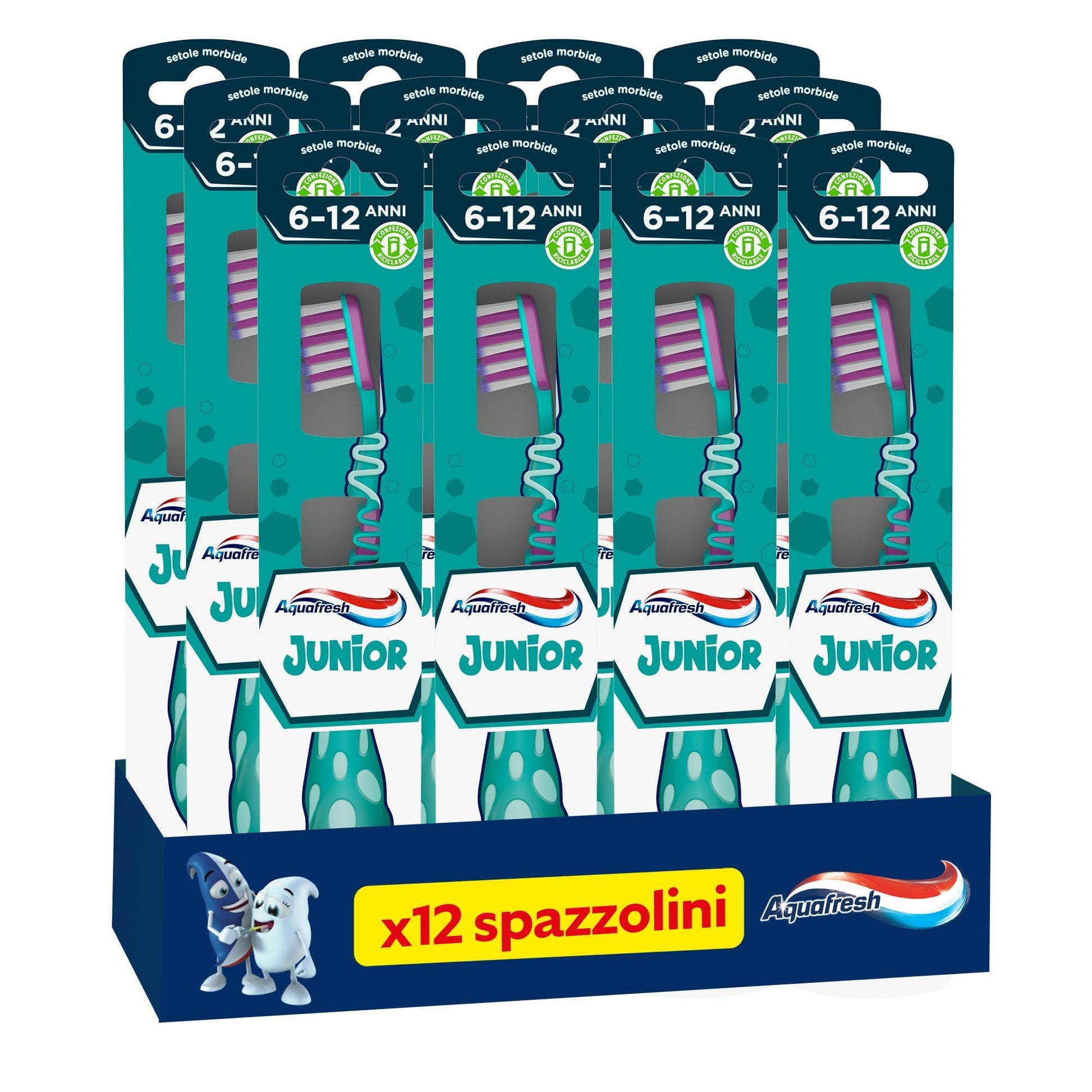 Aquafresh Junior, Spazzolino Denti per Bambini 6-12 anni, Denti da Latte e Permanenti, Setole Morbide, Pulizia Efficace, Collo Flessibile, Pacco da 12