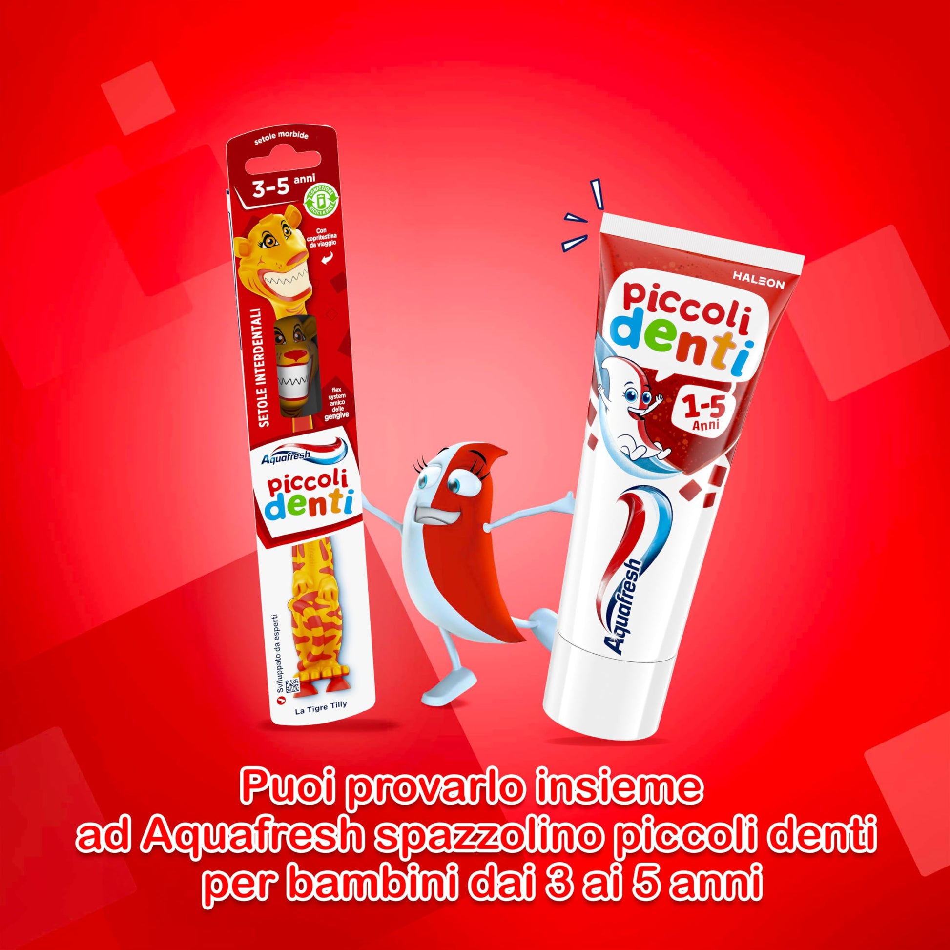 Dettagli: Descrizione Descrizione: Lo smalto dei denti del tuo bambino è il 50% più sottile del tuo e più sensibile agli attacchi degli zuccheri. Il dentifricio Aquafresh Piccoli Denti è studiato specificamente da esperti di igiene orale per bambini da 1 a 5 anni, con una bassa abrasività e in più 24 ore di protezione dagli acidi degli zuccheri fornita dal fluoro. Il dentifricio Aquafresh Piccoli Denti è studiato in modo specifico per aiutare a proteggere i denti del tuo bambino durante la crescita, inoltre: • Aiuta a proteggere lo smalto • Ha bassa abrasività • Spazzolando, pulisce delicatamente • Aiuta a proteggere dalla carie DENTIFRICIO AL FLUORO Istruzioni: SEGUIRE SEMPRE LE INDICAZIONI RIPORTATE SULLA CONFEZIONE. Lavarsi i denti due volte al giorno fino ad un massimo di tre; minimizzare l’ingerimento e sputare. Tenere fuori dalla portata dei bambini piccoli. Bambini fino a 6 anni: usare una piccola quantità di dentifricio sotto la supervisione di un adulto per ridurre al minimo l’ingerimento. In caso di assunzione di fluoruro da altre fonti consultare il dentista o il medico. Se dovessero insorgere irritazioni, sospendere l’uso del prodotto. Rivolgersi appena possibile al dentista o al medico se si manifestano gonfiore della bocca o della faccia. Non utilizzare se allergici a uno qualsiasi degli ingredienti. Da utilizzare solo dopo la comparsa del primo dentino. Ingredienti: Aqua, Hydrated Silica, Sorbitol, Glycerin, PEG-6, Xanthan Gum, Titanium Dioxide, Aroma, Carrageenan, Sodium Saccharin, Sodium Methyl Cocoyl Taurate, Cocamidopropyl Betaine, Sodium Fluoride, Limonene, CI 73360, CI 74160. Contiene: Fluoruro di Sodio 0.111% p/p (500 ppm Fluoruro). PM-IT-AQU-22-00003 Marchi di Haleon o sue licenzianti. ©2023 Haleon o sue licenzianti L’utente può segnalare un evento avverso al numero verde Haleon 800.931.556 oppure all’e-mail: mystory.it@haleon.com Haleon Italy S.r.l., Via Monte Rosa 91, 20149 Milano Indicazioni Spazzolare delicatamente i denti due volte al giorno Avviso di sicurezza Utilizzare una piccola quantità di dentifricio sotto la supervisione di un adulto per ridurre al minimo l'ingestione. In caso di assunzione di fluoro da altre fonti, consultare il proprio dentista o medico. Se si verifica irritazione, interrompere l'uso del farmaco. Consultare il proprio dentista o medico il prima possibile se si nota gonfiore alla bocca o al viso.