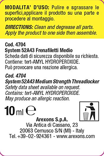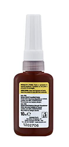 - Modo d'uso - Applicare il prodotto tra bullone e dado. Applicare il prodotto sul fondo del foro, assemblare e serrare ed attendere la polimerizzazione. Le superfici devono essere pulite e asciutte.