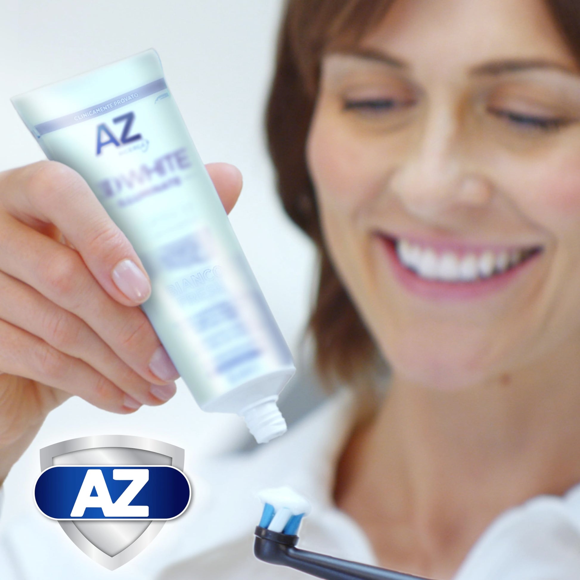 Dettagli: Il dentifricio AZ 3DWhite Illuminate Bianco Glossy è dotato dell’azione sbiancante Az. Sbianca rimuovendo le macchie superficiali già dalla prima applicazione, rimuove fino al 100% delle macchie superficiali in 5 giorni e protegge i denti dagli acidi e dalle macchie superficiali future.