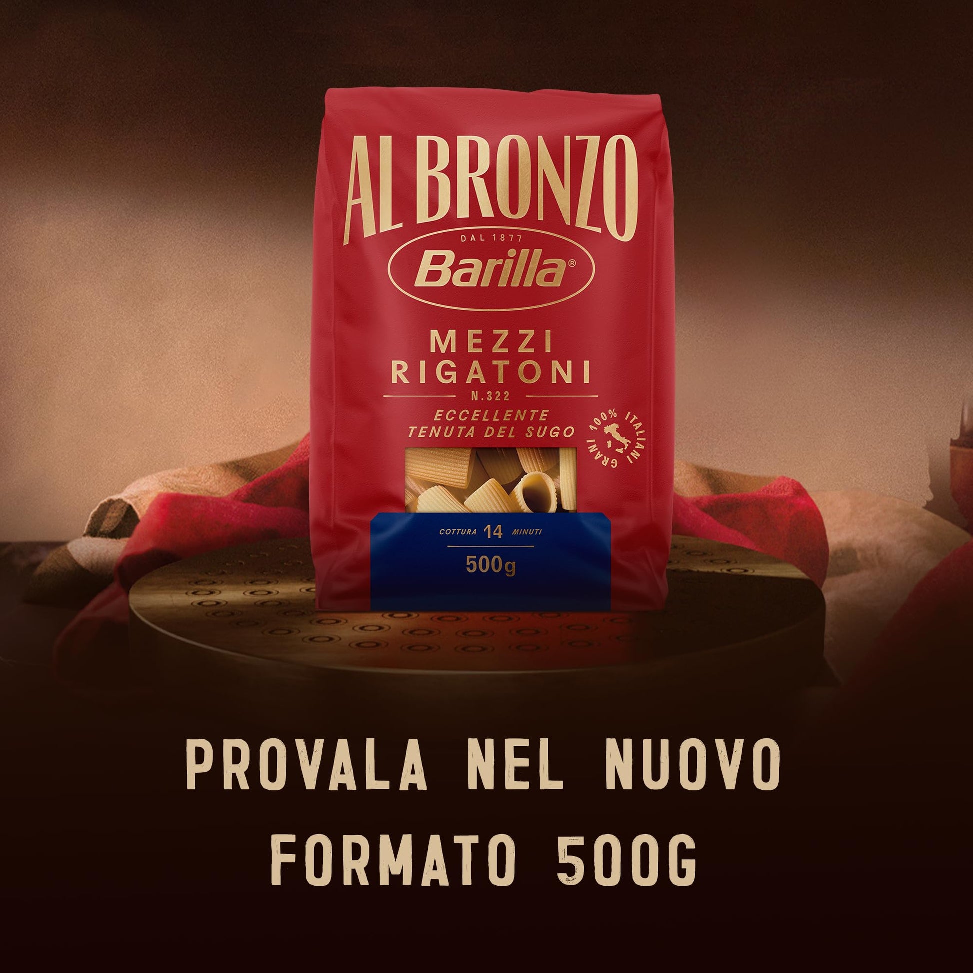 - BARILLA MEZZI RIGATONI AL BRONZO: i mezzi rigatoni Barilla per un’esperienza di gusto avvolgente e intensa. Una pasta trafilata al bronzo con metodo di lavorazione al bronzo grezzo spessa e corposa, dal colore giallo ambrato