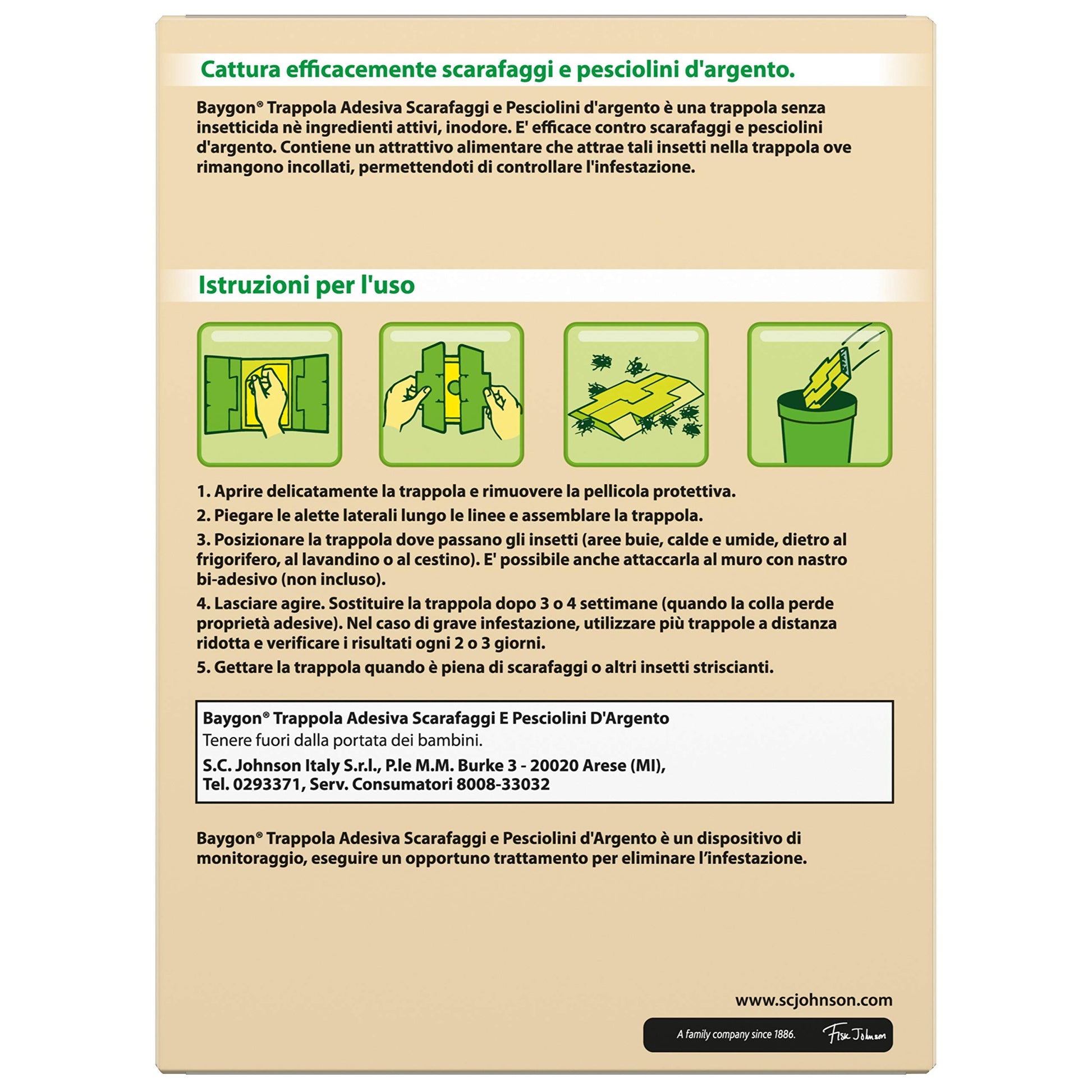 Dettagli: Baygon Trappola Scarafaggi Protezione Cucina e Pesciolini D'argento è una trappola senza insetticidi nè ingredienti attivi, inodore. È efficace contro scarafaggi e pesciolini d'argento. Contiene un attrattivo alimentare che attrae tali insetti.
