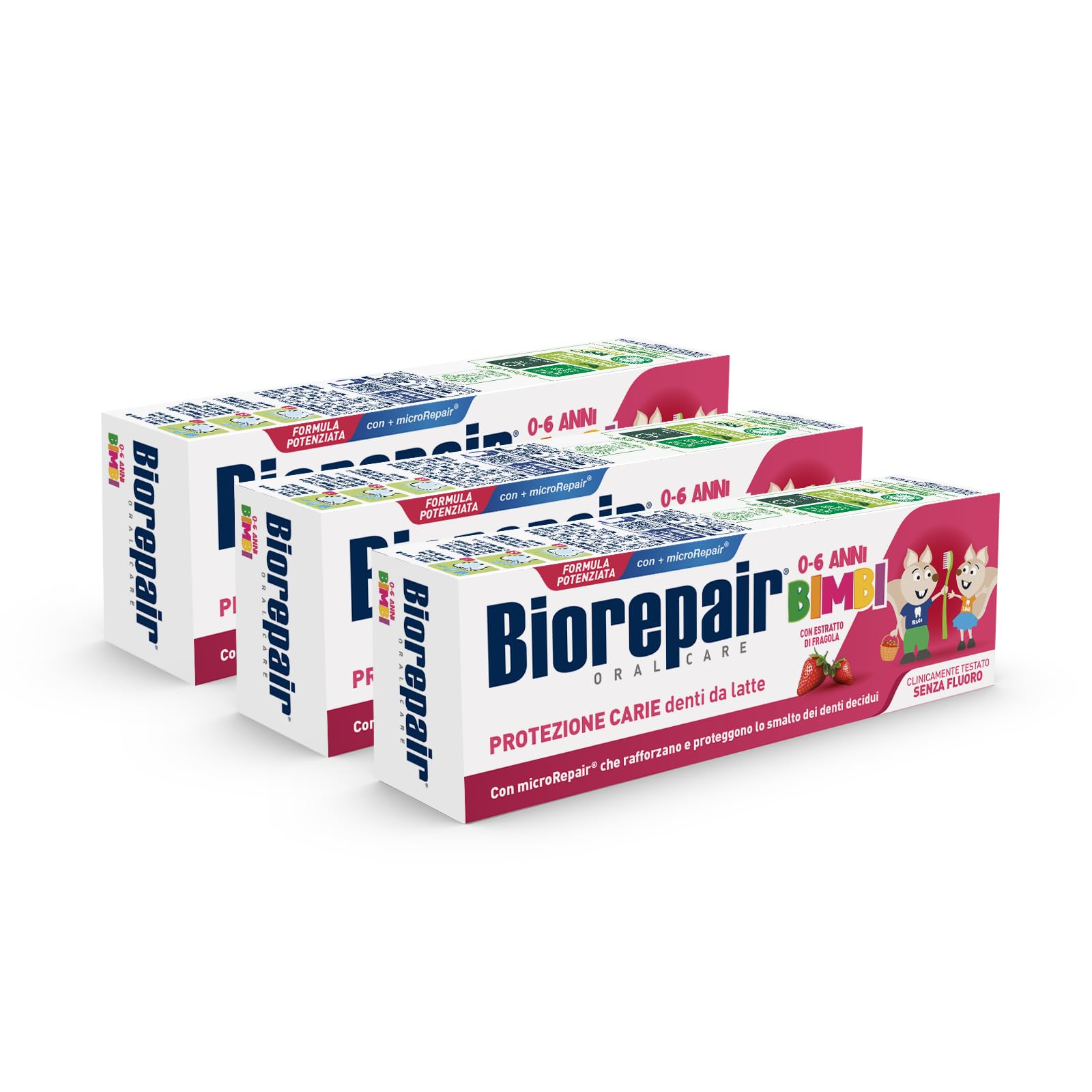 Biorepair, Dentifricio Bimbi 0-6 anni, 3 Confezioni, Dentifricio Biorepair per Bambini Senza Fluoro Gusto Fragola, Anticarie, per Gengive Sane, 50 ml