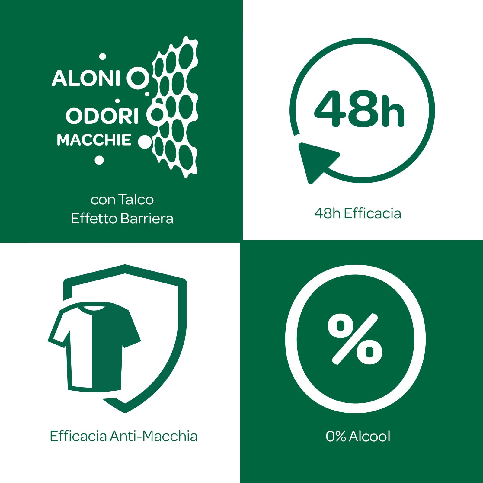 - FORMULA: con Talco Effetto Barriera. Questo mix unisce la protezione asciutta della polvere di talco con le molecole che catturano e non trasferiscono aloni, odori e macchie