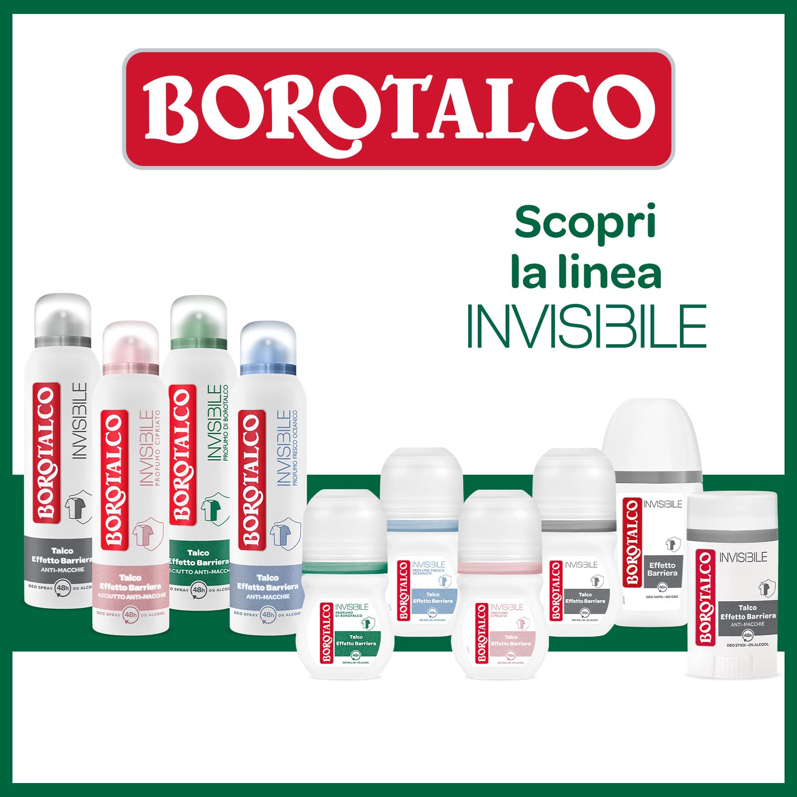 Borotalco, Deodorante Spray Invisibile Verde, Formula Senza Alcool con Talco Effetto Barriera, Cattura e Non Trasferisce Aloni, 48h di Efficacia, Profumo di Borotalco - 1 Flacone da 150 ml