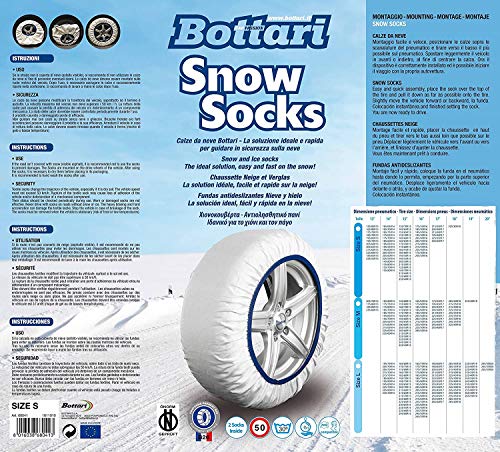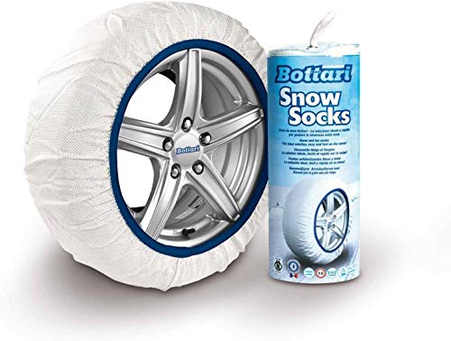 Dettagli: Bottari 68041: Bottari Snowsocks - Calze da neve per auto - Taglia S. Le calze da neve sono la soluzione rapida per guidare in sicurezza sulla neve. Queste calze da neve sono infatti rapidissime da applicare agli pneumatici. È sufficiente avvolgere lo pneumatico come se si stesse applicando appunto una calza. Questo vuol dire che non sono necessarie regolazioni o attrezzi per applicare le calze da neve, velocizzando le operazioni e rendendole semplici anche per i meno esperti. Le calze da neve Bottari Snowsocks sono compatibili con ABS per offrirti la massima sicurezza durante la guida e sono utilizzabili fino ad una velocità di 50 km/h. È possibile lavare le calze da neve dopo l'uso per mantenerle in perfetta condizione, lavandole ad una temperatura fino a 30C. Idonee per i seguenti pneumatici: R13: 155/80R13. 165/80R13. 175/70R13. 185/65R13. 185/70R13. 195/65R13. 195/70R13. 205/60R13. 205/65R13. 215/60R13. 225/60R13. 225/55R13. R14: 135/80R14. 145/80R14. 155/70R14. 155/80R14. 165/65R14. 165/70R14. 165/75R14. 175/65R14. 175/70R14. 185/60R14. 185/65R14. 195/55R14. 195/60R14. 205/55R14. 205/60R14. 225/55R14. R15: 125/80R15. 135/70R15. 135/80R15. 145/65R15. 145/70R15. 155/65R15. 155/70R15. 165/60R15. 165/65R15. 175/55R15. 175/60R15. 185/55R15. 185/60R15. 195/50R15. 195/55R15. 205/50R15. 215/45R15. 215/50R15. 235/45R15. R16: 175/50R16. 175/55R16. 185/50R16. 195/45R16. 195/50R16. 205/40R16. 205/45R16. 215/40R16. 215/45R16. 225/40R16. 255/35R16. R17: 195/40R17. 205/40R17. 215/35R17. 215/40R17. 225/35R17. 245/35R17. R18: 225/30R18.
