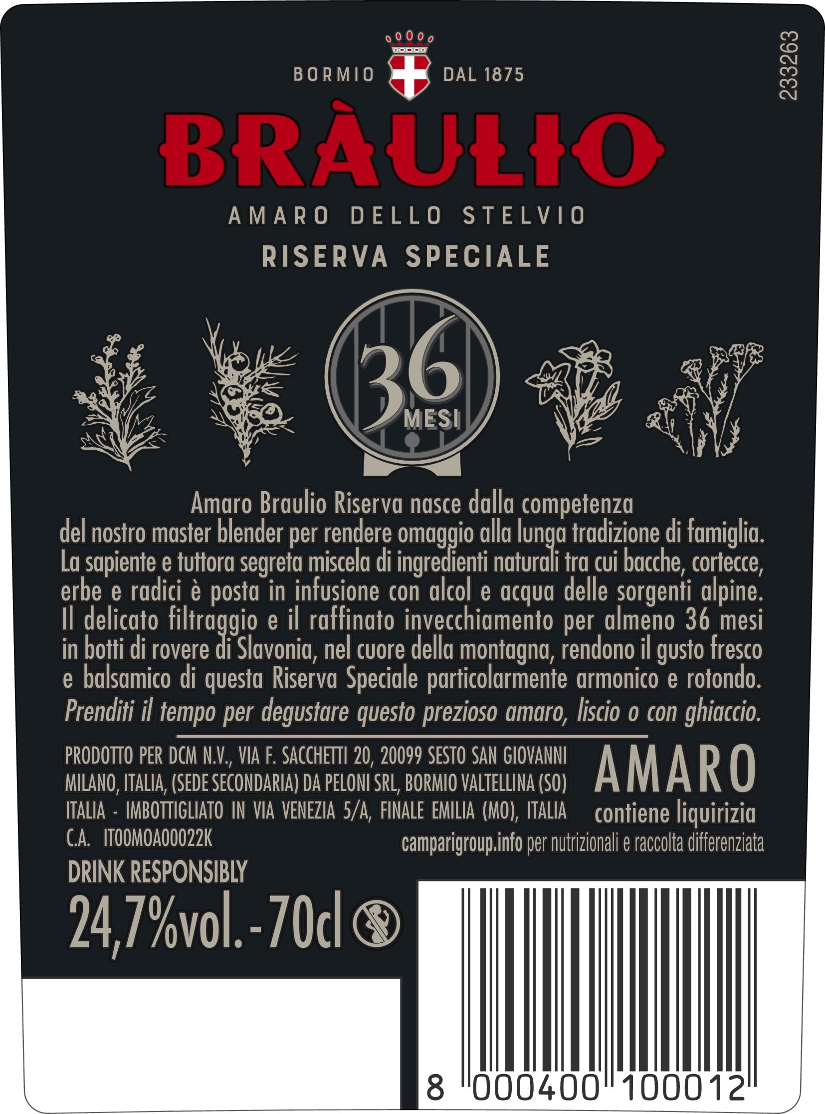 Braulio Riserva Speciale - Amaro dello Stelvio alle Erbe, 70 cl, Invecchiato 36 Mesi, 24,7% Vol