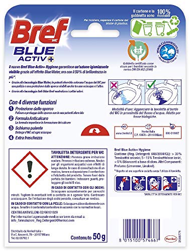 Dettagli: Descrizione Se cerchi un modo semplice per mantenere il tuo bagno pulito e fresco, Bref Blu Activ con Effetto Deodorante è un modo comodo e conveniente per assicurare pulizia e freschezza per il tuo WC dal primo all'ultimo sciacquo. Grazie alla sua formula con 4 azioni, questa tavoletta assicura: 1) Schiuma pulente che deterge il WC ad ogni sciacquo 2) Formula Anticalcare che aiuta a prevenire la formazione del calcare 3) Protezione Antisporco che impedisce la formazione dello sporco 4) Extra Freschezza per il tuo WC Bref Blue Activ assicura un profumo fresco e di lunga durata per tutto il tuo bagno. Aggancia semplicemente la tavoletta al bordo del WC in prossimità del flusso d’acqua. Durante lo sciacquo, l’acqua passerà attraverso la tavoletta rilasciando il suo potere pulente. Il cartone e la gabbietta sono 100% riciclabili. Per riciclare, separare il cartone dal blister di plastica. Ingredienti https://mysds.henkel.com/index.html#