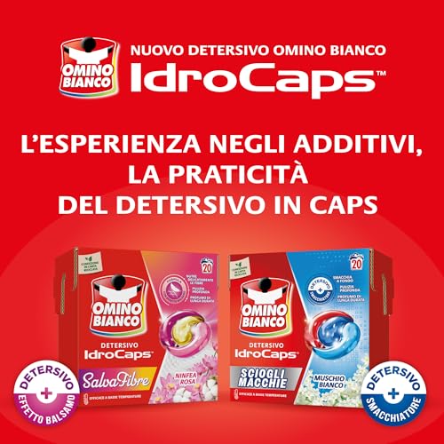 - IDROCAPS: efficaci già a basse temperature, le nuove Idrocaps di Omino Bianco smacchiano a fondo, lasciando i capi profumati a lungo per avvolgerti in una piacevole sensazione di pulito.