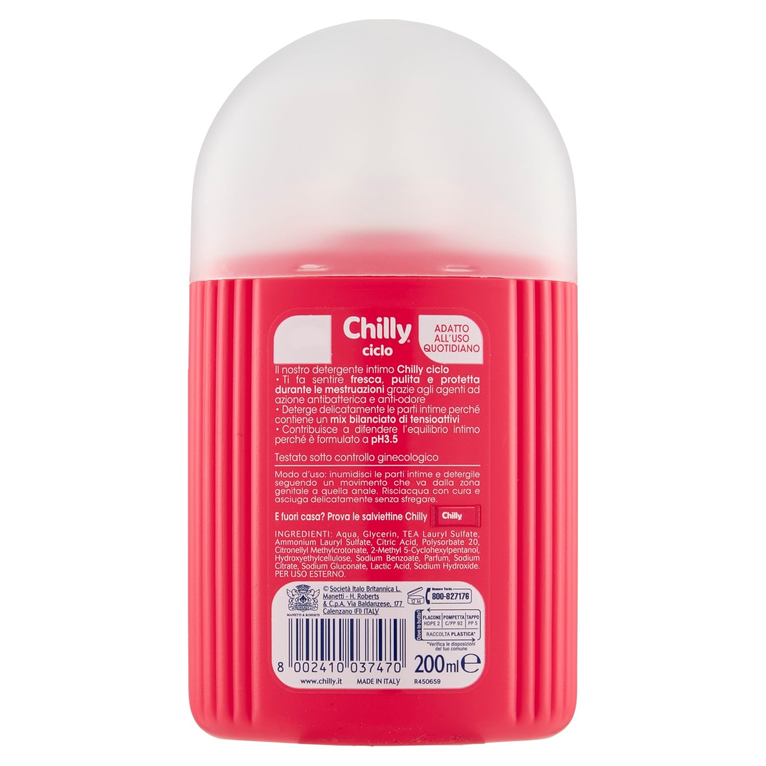 Dettagli: Descrizione CHILLY INTIMO DETERGENTE CICLO pH3,5 IGIENE PROLUNGATA ANTIODOR 200 ML Ingredienti Aqua, Glycerin, Tea Lauryl Sulfate, Ammonium Lauryl Sulfate, Citric Acid, Polysorbate 20, Citronellyl Methylcrotonate, 2-Methyl 5-Cyclohexylpentanol, Hydroxyethylcellulose, Sodium Benzoate, Parfum, Sodium Citrate, Sodium Gluconate, Lactic Acid, Sodium Hydroxide Avviso di sicurezza Solo per uso esterno. Evitare il contatto con gli occhi. Tenere lontano dalla fiamma nuda diretta o da fonti di calore.