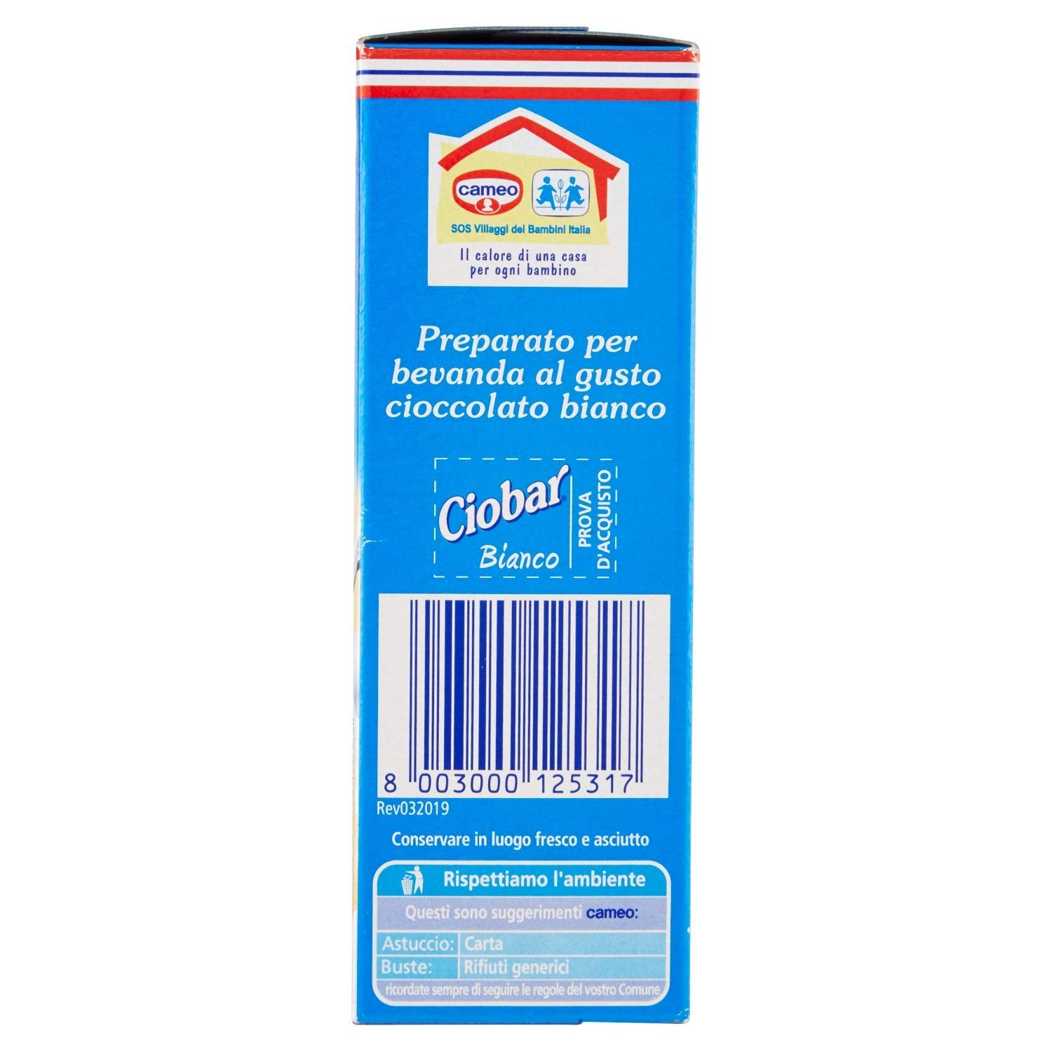 Dettagli: Descrizione Cameo ciobar bianco x5 105 g ciobar si addensa subito, quando giunge a bollore. Preparato per bevanda al gusto cioccolato bianco. Ingredienti farina di grano tenero,olio di palma,sale,zucchero,agenti lievitanti: carbonato acido di ammonio,carbonato acido di sodio,sciroppo di glucosio,proteine del siero di latte,semi di sesamo,latticello in polvere,semi di papavero,formaggio in polvere (con colorante: annatto),sciroppo di glucosio-fruttosio,farina di grano maltato,estratto di malto d'orzo,correttore di acidità: idrossido di sodio,emulsionante: mono-e digliceridi degli acidi grassi,semi di cumino,lievito,amido di frumento,aromi,proteine del latte,yogurt magro,siero di latte dolce in polvere,amido modificato,latte intero in polvere,pepe,può contenere tracce di soia Indicazioni - Mescola il contenuto di una busta in un pentolino con 125 ml di latte aggiunto un po' per volta.- Scalda a fiamma moderata, sempre mescolando, finché Ciobar si addensa e giunge a ebollizione.- Versa Ciobar nella tazza e gustalo!Nel Microonde:- Mescola il contenuto di una busta in una tazza grande con 125 ml di latte aggiunto poco per volta.- Cuoci a 750 watt per un minuto o 950 watt per 50 secondi e, se vuoi aumentare la densità, prolunga la cottura di 10 secondi.- Per preparare più tazze insieme, cuoci a 750 watt per 2 minuti. Se vuoi aumentare la densità, prolunga la cottura di 10 secondi alla volta finché ottieni la densità voluta. Avviso di sicurezza - Mescola il contenuto di una busta in un pentolino con 125 ml di latte aggiunto un po' per volta.- Scalda a fiamma moderata, sempre mescolando, finché Ciobar si addensa e giunge a ebollizione.- Versa Ciobar nella tazza e gustalo!Nel Microonde:- Mescola il contenuto di una busta in una tazza grande con 125 ml di latte aggiunto poco per volta.- Cuoci a 750 watt per un minuto o 950 watt per 50 secondi e, se vuoi aumentare la densità, prolunga la cottura di 10 secondi.- Per preparare più tazze insieme, cuoci a 750 watt per 2 minuti. Se vuoi aumentare la densità, prolunga la cottura di 10 secondi alla volta finché ottieni la densità voluta.