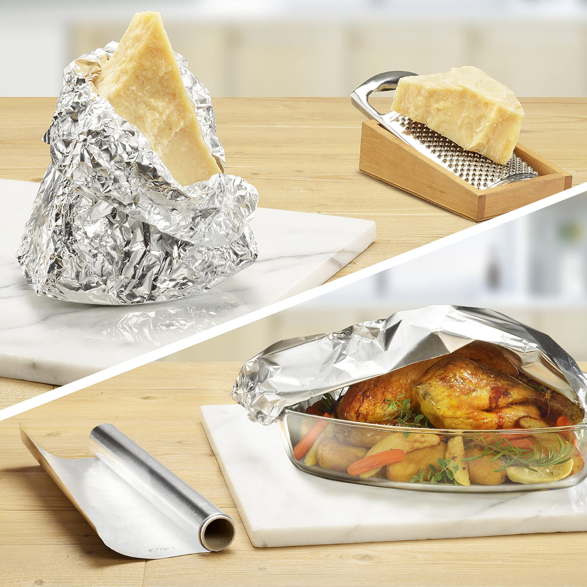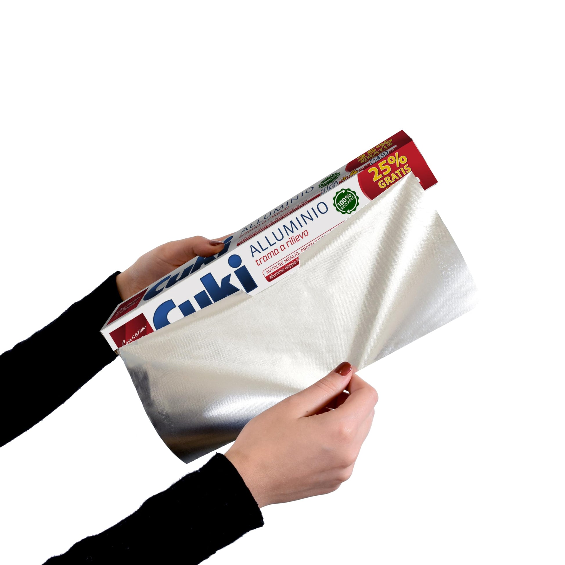 - Grazie alla sua capacità di aderenza a contenitori e teglie, Cuki Alluminio trama a rilievo è ideale per il trasporto dei cibi e per un'ottima cottura al forno.