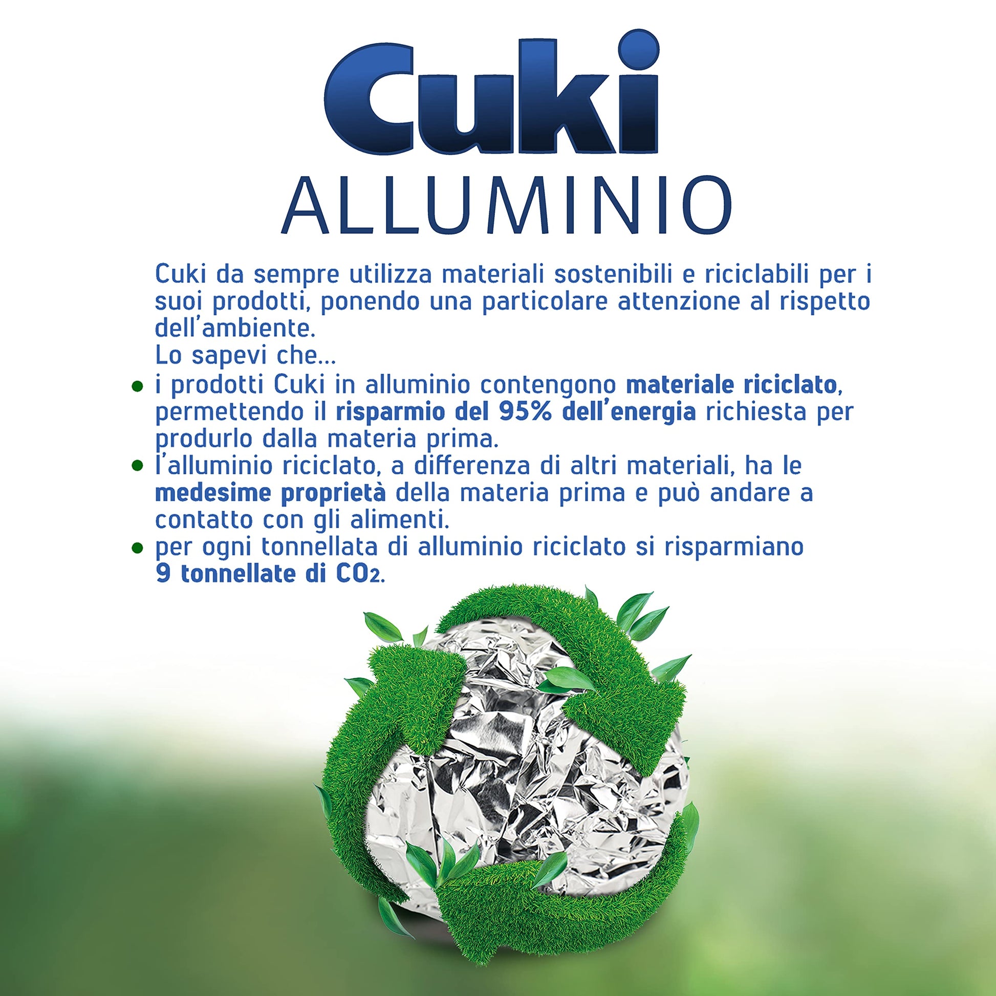 - Cuki Alluminio con trama a rilievo permette di conservare la freschezza dei cibi, minimizzando strappi e lacerazioni del foglio, anche nel caso di ripetuti "apri e chiudi".