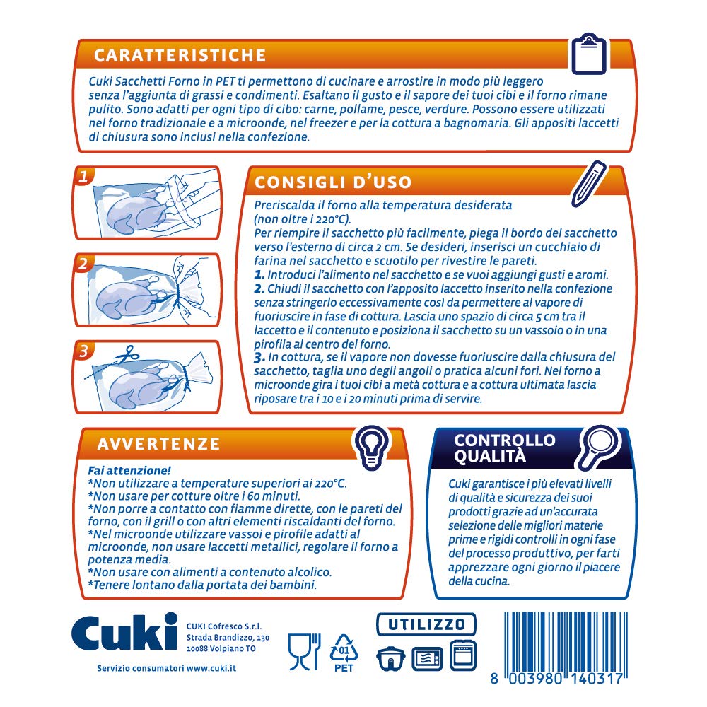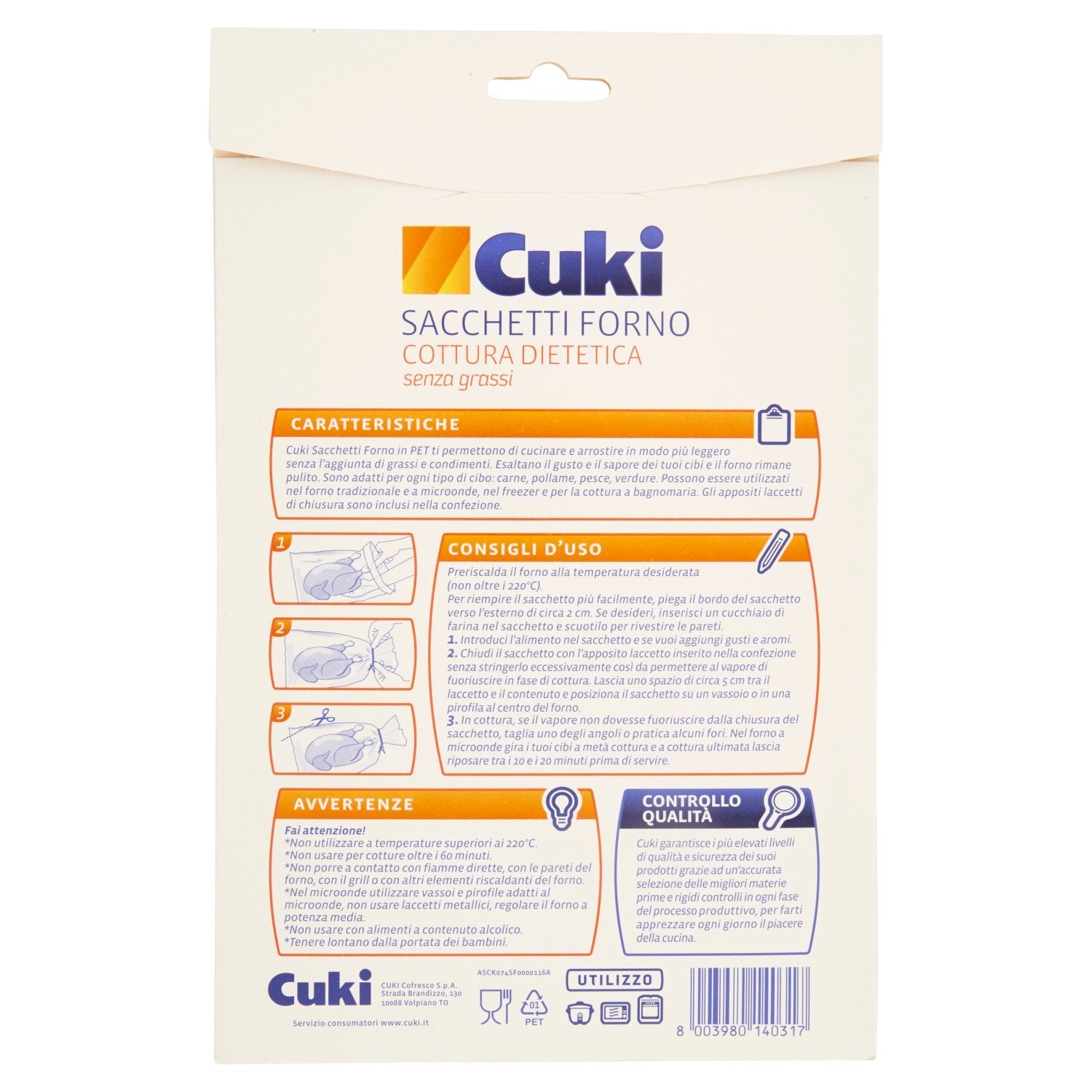 - Cuki Sacchetti Forno Cottura Dietetica ti permettono di cucinare e arrostire in modo più leggero senza l'aggiunta di grassi e condimenti.