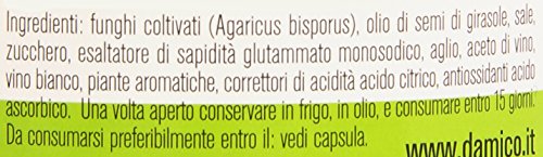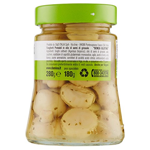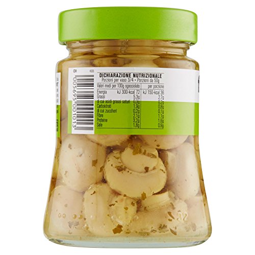 Dettagli: Descrizione Funghetti Prataioli in olio semi de girasole. Prodotto vegano. Ingredienti Funghi coltivati (Agaricus bisporus), Olio di semi di girasole, Sale, Zucchero, Esaltatore di sapidità glutammato monosodico, Aglio, Aceto di vino, Vino bianco, Piante aromatiche, Correttori di acidità acido citrico, Antiossidanti acido ascorbico