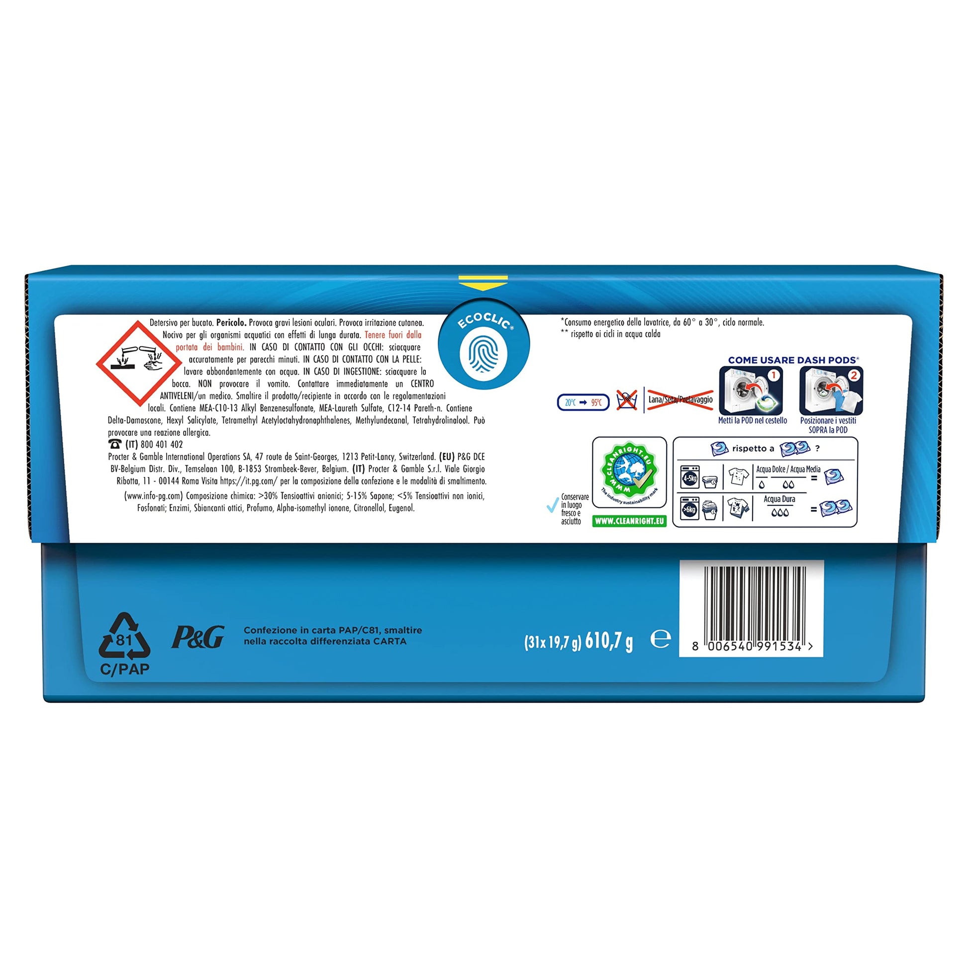 Dettagli: Descrizione Le Pods per bucato Dash Salvacolore garantiscono un pulito impeccabile e colori brillanti, anche a freddo e in cicli brevi. Sono dotate di un design multi-scomparto che mantiene gli ingredienti stabili e separati fino al lavaggio, offrendo un potere pulente superconcentrato. La pellicola di Dash Pods si dissolve completamente al contatto con l’acqua. Usa Dash Pods insieme a Lenor Ammorbidente e Lenor Unstoppables per una freschezza e morbidezza ancora maggiori. Ingredienti >30% Tensioattivi Anionici, 5-15% Sapone, <5% Tensioattivi Non Ionici, Fosfonati, Enzimi, Sbiancanti Ottici, Profumo, Alpha-Isomethyl Ionone, Citronellol, Eugenol