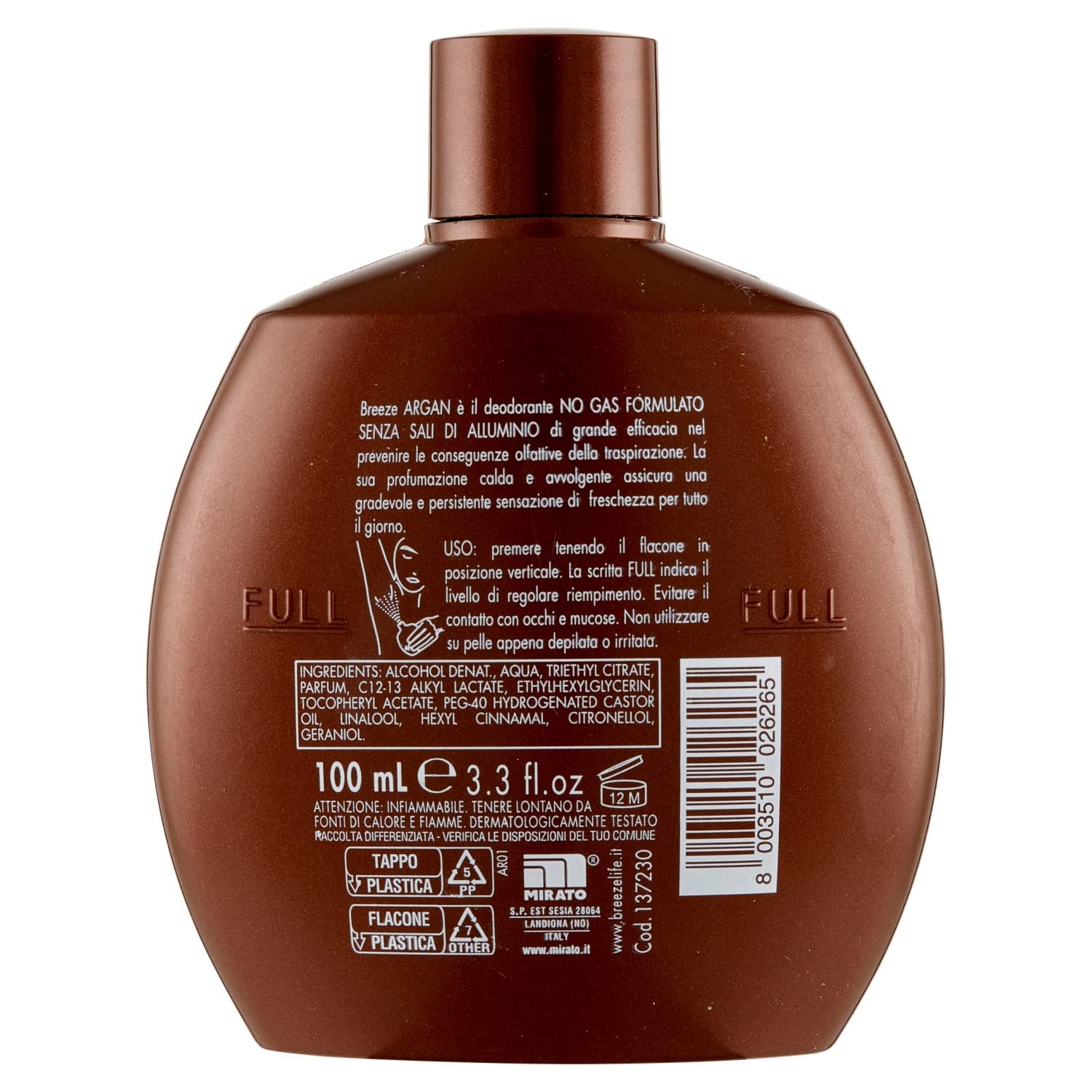 Dettagli: Descrizione Breeze Argan è il deodorante no gas formulato senza sali di alluminio di grande efficacia nel prevenire le conseguenze olfattive della traspirazione. La profumazione calda e avvolgente assicura una gradevole e persistente sensazione di freschezza per tutto il giorno Indicazioni 1. Agitare delicatamente la bottiglia. 2. Rimuovere il tappo. 3. Applicare una piccola quantità di deodorante sulle ascelle. 4. Lasciare asciugare prima di vestirsi.