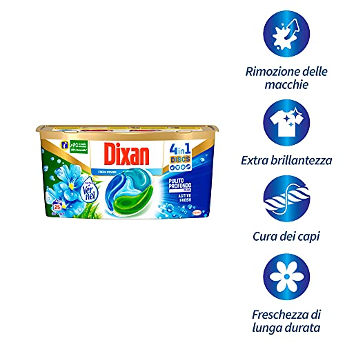 - Dixan Discs garantisce ai capi la pulizia perfetta di Dixan e la freschezza di Vernel; inserisci Discs capsule lavatrice nel cestello prima dei capi per un risultato ottimale.