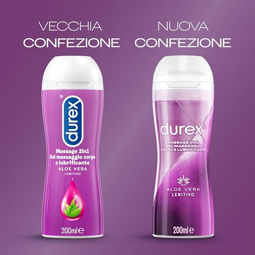 Dettagli: Descrizione Durex Massage 2 in 1 è un gel lubrificante intimo a base acquosa, pensato per massaggi rilassanti e per i momenti più intimi. Grazie all'azione lenitiva dell'aloe vera, puoi usarlo sulle parti intime esterne per ridurne la secchezza durante i rapporti sessuali, per un maggior piacere. Ha una formula delicata e senza profumo, si lava via facilmente, non macchia, non unge. Il gel lubrificante Durex Massage 2 in 1 è compatibile con il lattice del profilattico, ma non è un contraccettivo e non contiene spermicida. Usalo con i preservativi Durex per un piacere sempre sicuro, e con la gamma di sex toys per un'esperienza intensa. A ph fisiologico, in caso di irritazione o altri fenomeni allergici, consultare un medico. Evitare il contatto con gli occhi. I Gel Durex sono dermatologicamente testati e sono testati elettronicamente al 100%. Devono essere conservati in luogo fresco e asciutto, lontano da fonti di calore. La confezione contiene un flacone di "Durex "Massage 2 in 1" da 200ml, e viene spedito in un imballaggio anonimo per garantire la tua privacy. Ingredienti Aqua Propylene glycol Benzoic acid Aloe barbadensis leaf juice Sodium saccharin Sodium hydroxide Hydroxyethylcellulose Indicazioni Applicare una piccola quantità di gel lubrificante sull'area desiderata. Avviso di sicurezza Tenere fuori dalla portata dei bambini. Evitare il contatto con la pelle e gli occhi. In caso di ingestione, cercare un aiuto medico immediato. Contenuto della confezione Confezione da 200ml