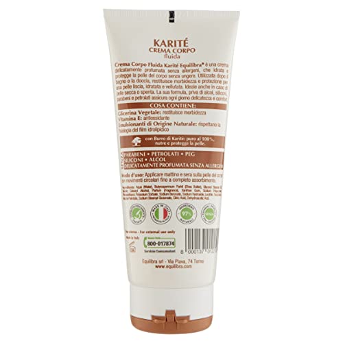 Dettagli: Descrizione Crema corpo fluida karité equilibra è una crema delicatamente profumata senza allergeni, che idrata e protegge la pelle del corpo senza ungere. Utilizzata dopo il bagno o la doccia, restituisce morbidezza e protezione per una pelle liscia, idratata e vellutata. Ottima anche in caso di pelle secca o spenta. La sua formula, priva di alcol, siliconi, parabeni e petrolati assicura ogni giorno delicatezza e comfort. Ingredienti Aqua (Water), Ethylhexyl Palmitate, Prunus Amygdalus Dulcis (Sweet Almond) Oil, Parfum (Fragrance), Stearic Acid, Isoamyl Laurate, Butyrospermum Parkii (Shea) Butter, Glycerin, Macadamia Ternifolia Seed Oil, Tocopheryl Acetate, Xanthan Gum, Ceteareth-25, Carbomer, Glyceryl Stearate, Cetearyl Alcohol, Cetyl Alcohol, Lecithin, Tocopherol, Ascorbyl Palmitate, Sodium Phytate, Sodium Hydroxide, Ethylhexylglycerin, Phenoxyethanol, Citric Acid