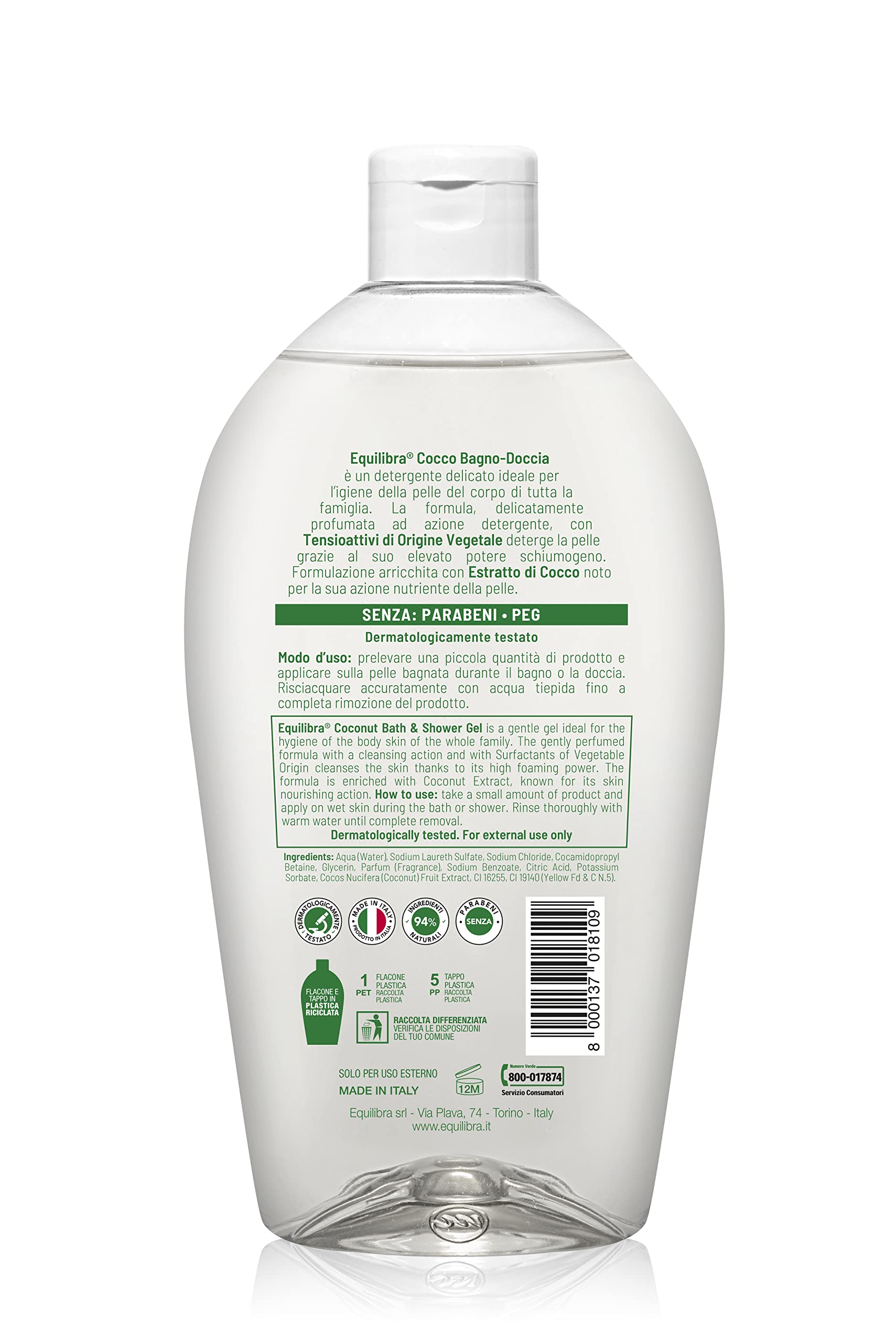 Dettagli: Descrizione Equilibra Cocco Bagno-Doccia è un detergente delicato ideale per l’igiene della pelle del corpo di tutta la famiglia. La formula, delicatamente profumata ad azione detergente, con Tensioattivi di Origine Vegetale deterge la pelle grazie al suo elevato potere schiumogeno. Formulazione arricchita con Estratto di Cocco noto per la sua azione nutriente della pelle. Prelevare una piccola quantità di prodotto e applicare sulla pelle bagnata durante il bagno o la doccia. Risciacquare accuratamente con acqua tiepida fino a completa rimozione del prodotto. 94% di ingredienti di origine naturale. Senza parabeni e PEG. Ingredienti Ingredients: Aqua (Water), Sodium Laureth Sulfate, Sodium Chloride, Cocamidopropyl Betaine, Glycerin, Parfum (Fragrance), Sodium Benzoate, Citric Acid, Potassium Sorbate, Cocos Nucifera (Coconut) Fruit Extract, CI 16255, CI 19140 (Yellow Fd & C N.5). Fare sempre riferimento alle formule riportate sulle confezioni