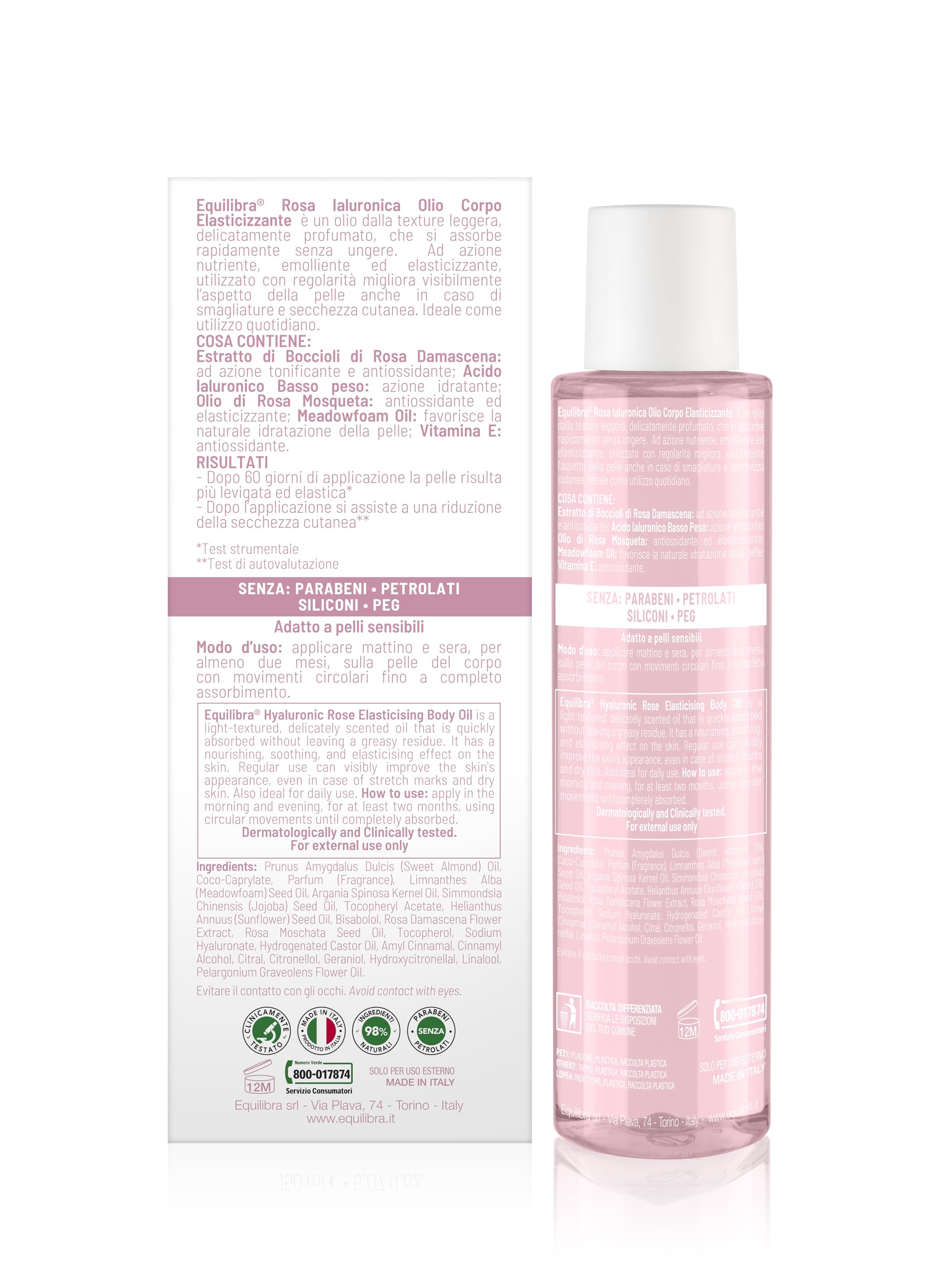 Dettagli: Descrizione Equilibra Rosa Ialuronica Olio Corpo Elasticizzante è un olio dalla texture leggera, delicatamente profumato, che si assorbe rapidamente senza ungere. Ad azione nutriente, emolliente ed elasticizzante, utilizzato con regolarità migliora visibilmente l’aspetto della pelle anche in caso di smagliature e secchezza cutanea. Ideale anche come utilizzo quotidiano. Con Estratto di Boccioli di Rosa Damascena ad azione tonificante e antiossidante, Acido Ialuronico a Basso peso ad azione idratante, Olio di Rosa Mosqueta antiossidante ed elasticizzante, Meadowfoam Oil che favorisce la naturale idratazione della pelle, Vitamina E antiossidante. Applicare mattino e sera, per almeno due mesi, sulla pelle del corpo con movimenti circolari fino a completo assorbimento. Ingredienti Ingredients: Prunus Amygdalus Dulcis (Sweet Almond) Oil, Coco-Caprylate, Parfum (Fragrance), Limnanthes Alba (Meadowfoam) Seed Oil, Argania Spinosa Kernel Oil, Sodium Hyaluronate, Simmondsia Chinensis (Jojoba) Seed Oil, Rosa Damascena Flower Extract, Rosa Moschata Seed Oil, Bisabolol, Helianthus Annuus (Sunflower) Seed Oil, Tocopheryl Acetate, Tocopherol, Hydrogenated Castor Oil, Amyl Cinnamal, Cinnamyl Alcohol, Citral, Citronellol, Geraniol, Hydroxycitronellal, Linalool, Pelargonium Graveolens Flower Oil. Fare sempre riferimento alle formule riportate sulle confezioni Indicazioni Applicare mattino e sera, per almeno due mesi, sulla pelle del corpo con movimenti circolari fino a completo assorbimento, concentrandosi sulle aree desiderate. Avviso di sicurezza Solo per uso esterno