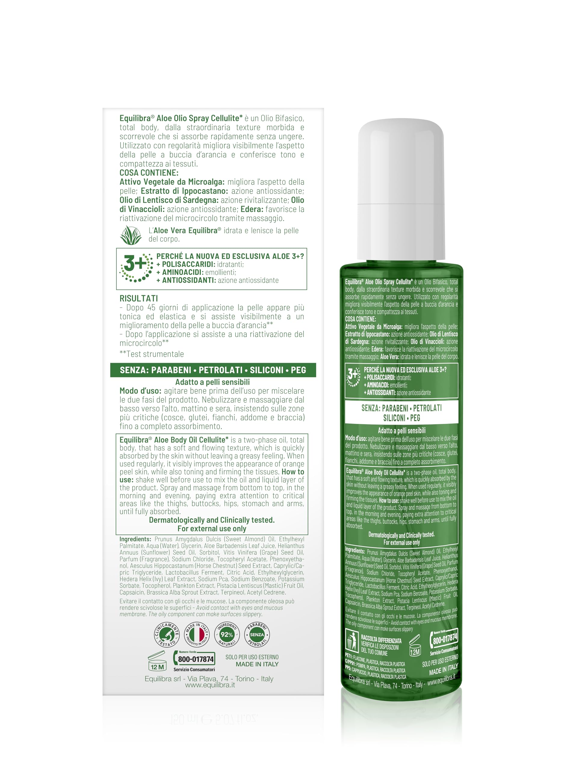 - OLIO CORPO SPRAY CELLULITE*: olio bifasico, total body, dalla straordinaria texture morbida e scorrevole che si assorbe rapidamente senza ungere. Con 92% di ingredienti di origine naturale