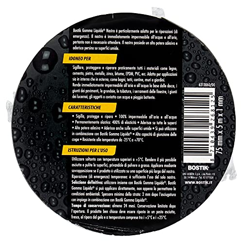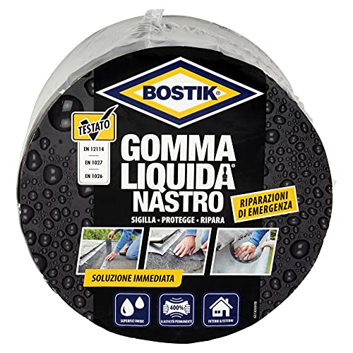 Dettagli: Bostik Gomma Liquida Nastro Autoagglomerante autoagglomerante sigilla, protegge, ripara e isola tutti i materiali. Il nastro è 100% impermeabile all’aria e all’acqua, aderisce a se stesso e può essere utilizzato in qualsiasi situazione: in interni ed esterni e anche sott’acqua. Campi di applicazione * Riparare: rapidamente e facilmente tubi (rigidi e flessibili come tubi per irrigazione), raccordi e sifoni. Perfetto per la riparazione e la sigillatura rapida e semplice di perdite. * Impermeabilizzare: raccordi, collegamenti, prese e cavi elettrici. Adatto anche per sigillare e isolare cavi elettrici. * Proteggere: può essere utilizzato per rendere antiscivolo gli strumenti e i manici. Protegge dalla ruggine. Istruzioni di utilizzo: Non è necessario pulire la superficie. Evitare però l'accumulo di sporco tra gli strati durante l'avvolgimento. 1. Tagliare la quantità di nastro necessaria. 2. Rimuovere la pellicola protettiva dal nastro. 3. Applicare un primo strato in modo che il nastro risulti completamente sovrapposto a se stesso. 4. Estendere il nastro del 200-300% e procedere ad avvolgerlo attorno alla superficie, mantenendo una sovrapposizione del nastro a se stesso del 50%. 5. Applicare l'ultimo strato con una sovrapposizione completa del nastro a se stesso e premere con forza. Il processo di fusione avviene in pochi secondi. Più viene esteso il nastro durante l'avvolgimento, più rapidamente avviene la fusione.