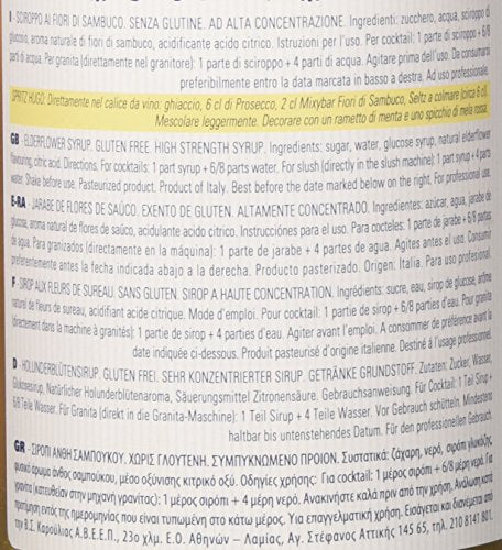 Dettagli: Descrizione Giallo paglierino con riflessi dorati, diluito mantiene la sua tonalità. Al naso intensi profumi floreali di fiori di sambuco con sentori di pesco in fiore. Al palato è dolce, morbido e piacevolmente equilibrato con un finale persistente. Spumanti e distillati bianchi (vodka e gin) sono i tipici abbinamenti. Imprescindibile per Hugo spritz e inedito per la granita. Ingredienti zucchero, acqua, sciroppo di glucosio, aroma naturale di fiori di sambuco, acidificante acido citrico.