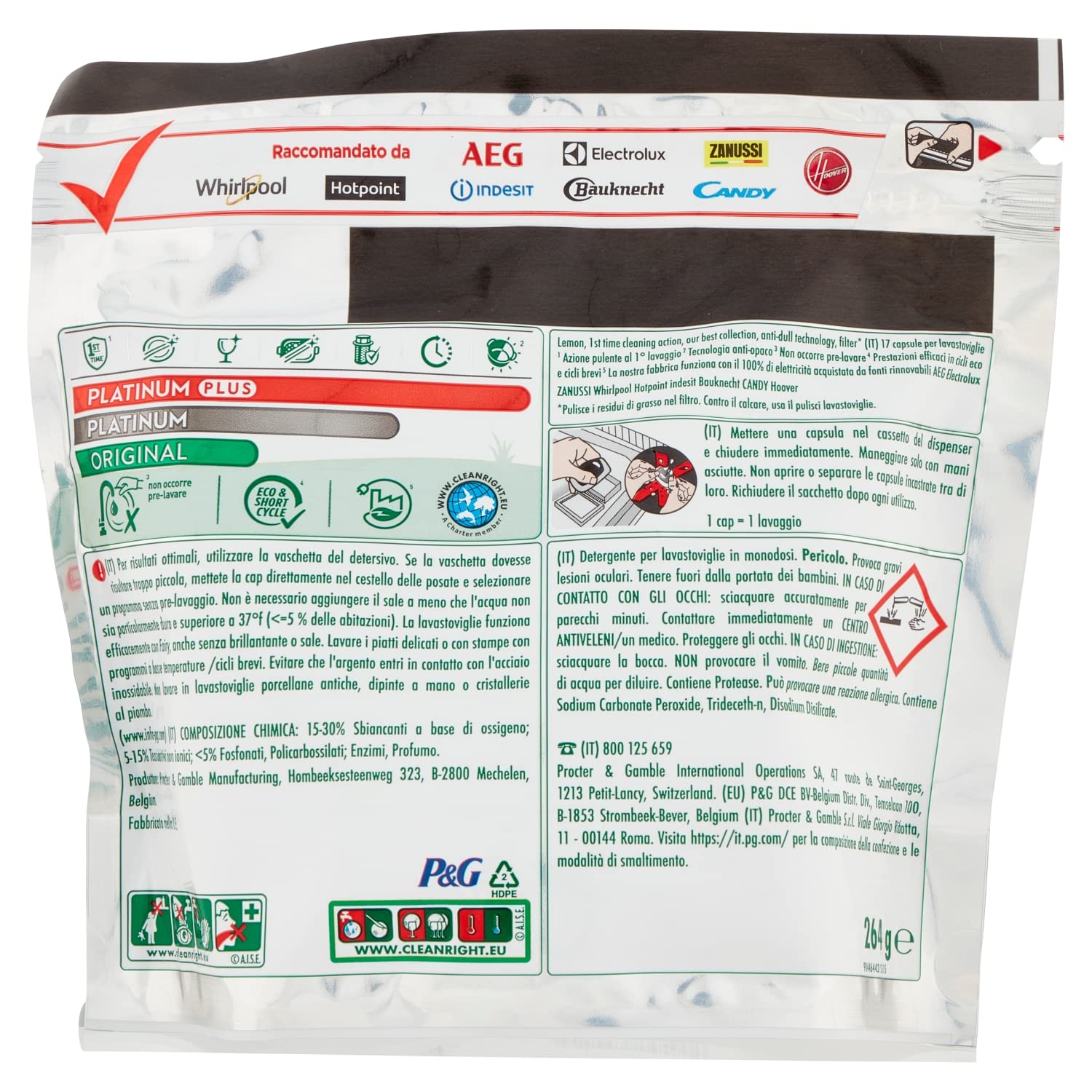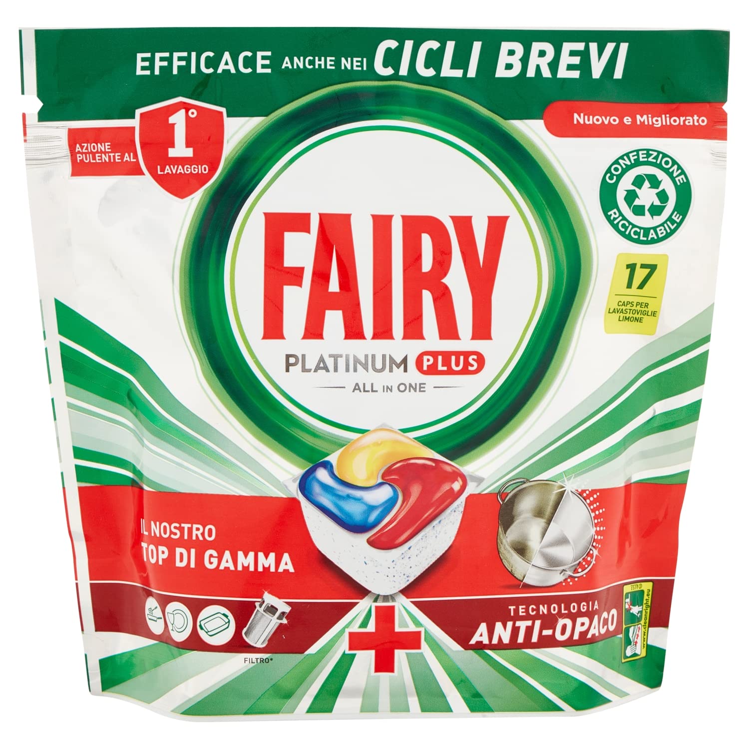 Dettagli: Descrizione prodotto Fairy Pastiglie Lavastoviglie Platinum Plus Anti-Opaco, Detersivo Piatti Limone, 17 Capsule 264 g Ingredienti (www.info-pg.com) Composizione chimica:, 15-30% Sbiancanti a base di ossigeno, 5-15% Tensioattivi non ionici, <5% Fosfonati, Policarbossilati, Enzimi, Profumo