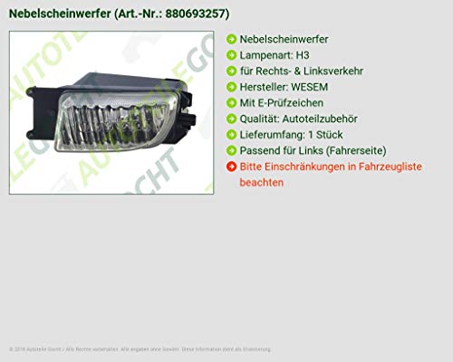 - Fendinebbia, Tipo di lampada: H3, adatto per lato sinistro (lato guidatore), per circolazione & sinistra, produttore: wesem accessori, con marchio di controllo e, qualità: Auto, contenuto della confezione: 1 pezzi