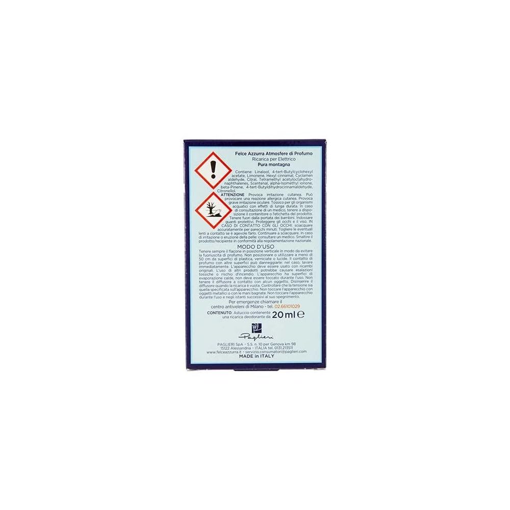 Dettagli: Descrizione Felce Azzurra Pura Montagna Refil Deodorante per ambienti Ricarica per Diffusore 20ml Fresco e Accordo Trasparente con Note ozonizzate e sfaccettature di agrumi scintillanti che in combinazione con influenze aromatiche e legnose causano la purezza incontaminata della colla di montagna.