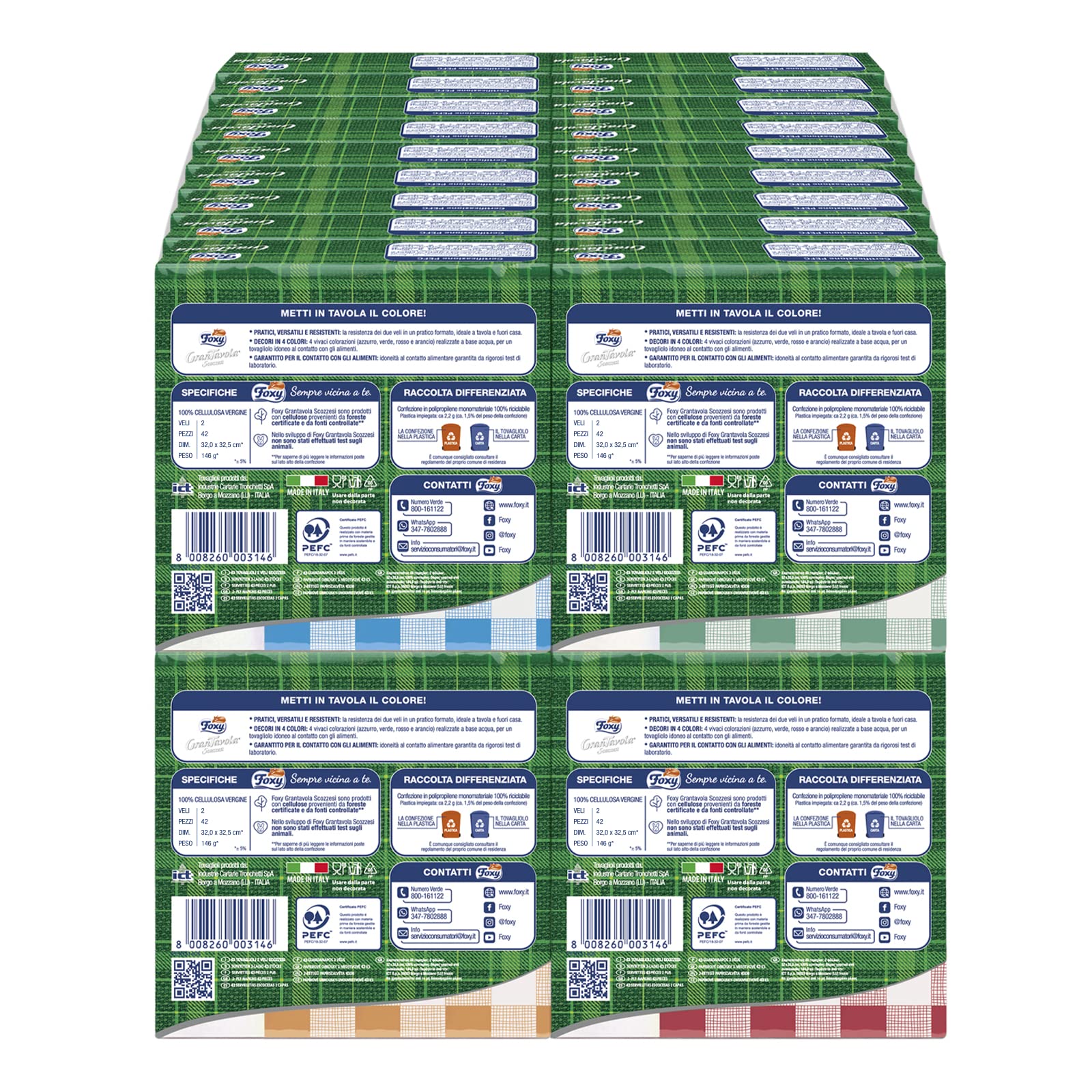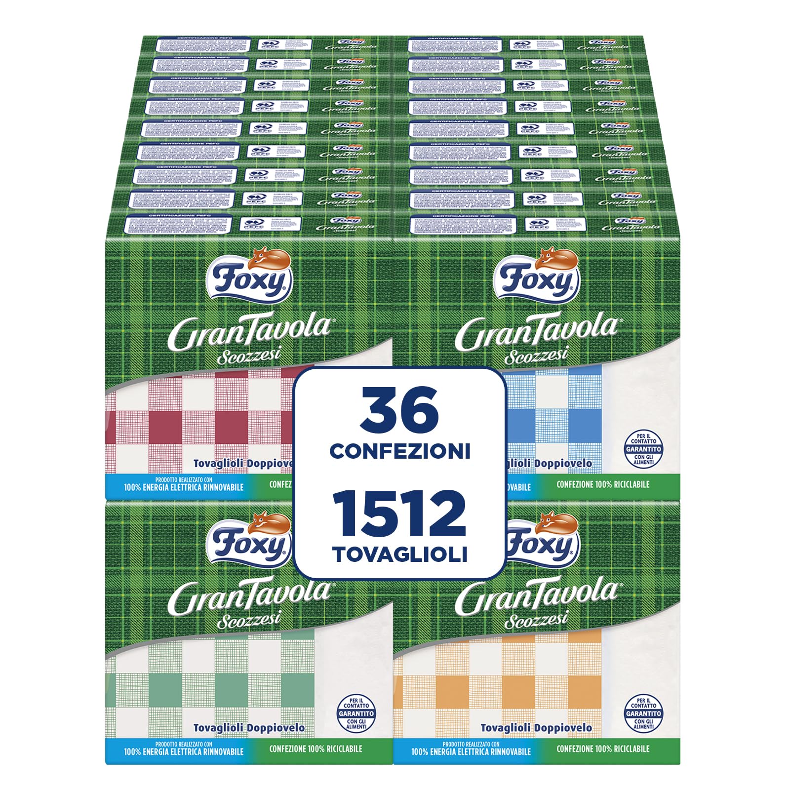 Foxy GranTavola Scozzesi | Tovaglioli Doppiovelo | 36 Confezioni Da 42 Pezzi 32x32,5cm | Decoro Scozzese 4 Colori | PEFC | 100% Energia Elettrica Rinnovabile | Confezione 100% Riciclabile