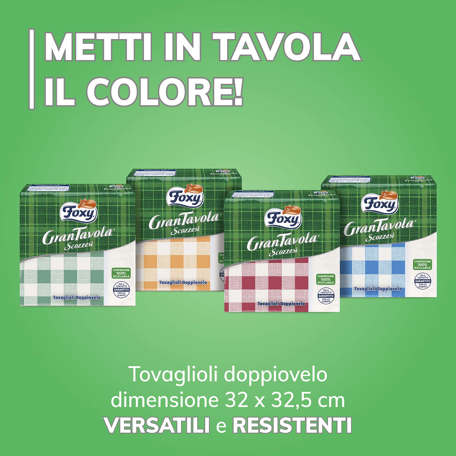 Dettagli: Descrizione I tovaglioli doppiovelo pratici e colorati. Versatili e resistenti, uniscono la qualità dei due veli ad un comodo formato, ideale sia a tavola che fuori casa. Foxy GranTavola Scozzesi portano l'allegria in tavola con i loro decori assortiti in 4 vivaci colorazioni: azzurro, verde, rosso e arancione. I decori sono realizzati utilizzando colori base acqua, per tovaglioli idonei al contatto alimentare. L'idoneità degli tovaglioli Foxy al contatto con gli alimenti è garantita da rigorosi test condotti presso laboratori qualificati. I tovaglioli Foxy GranTavola Scozzesi sono prodotti con 100% pura cellulosa vergine proveniente da foreste gestite in maniera responsabile e garantite dalla certificazione PEFC. L'imballo esterno è 100% riciclabile. La scatola contiene 36 confezioni da 42 pezzi, per un totale di 1512 tovaglioli doppio velo alta qualità. Foxy, sempre vicina a te. Ingredienti 100% pura cellulosa vergine, certificata PEFC™