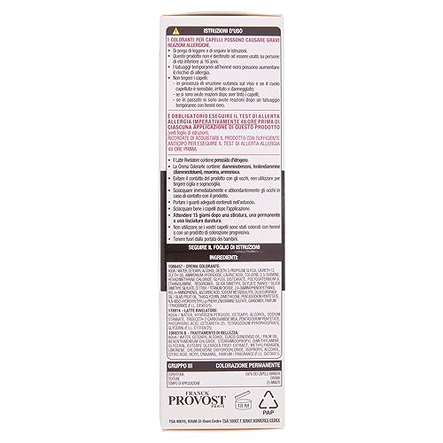 Dettagli: Descrizione Con la tinta permanente di Franck Provost, grazie alla tecnologia Salon Pro e al pennello di precisione, puoi ottenere facilmente un risultato professionale direttamente a casa tua. La colorazione di Franck Provost copre il 100% dei capelli bianchi per un risultato colore brillante e a lunga durata, ricco di sfumature raffinate ed eleganti. Ingredienti Le liste degli ingredienti dei prodotti di L’Oréal Paris vengono regolarmente aggiornate. Ti invitiamo quindi a leggere la lista che trovi sulla confezione del prodotto per assicurarti che gli ingredienti siano adatti al tuo utilizzo personale. Indicazioni A seconda delle tue esigenze, puoi utilizzare la tinta capelli di Franck Provost per colorare l’intera capigliatura o semplicemente per ritoccare la ricrescita. - Applicazione completa: 1. Mescola l’intera dose di latte rivelatore e crema colorante; 2. Applica la miscela sui capelli asciutti e lascia in posa per 25 minuti; 3. Risciacqua e usa il Trattamento di Bellezza per avere capelli più morbidi ed esaltare il colore. - Ritocco ricrescita: 1. Mescola mezza dose di latte rivelatore e crema colorante; 2. Applica la miscela sui capelli asciutti e lascia in posa; 3. Risciacqua e usa il Trattamento di Bellezza per avere capelli più morbidi ed esaltare il colore. La tinta di Franck Provost non è destinata ad essere usata su persone di età inferiore ai 16 anni. Eseguire in tutti i casi un test di allerta allergia imperativamente 48 ore prima di ciascuna applicazione di questo prodotto seguendo le istruzioni contenute nel pack. Avviso di sicurezza Seguire le avvertenze riportate sulla confezione. Contenuto della confezione - latte rivelatore 60 ml, - crema colorante 40 ml, - trattamento di bellezza 10 ml, - un foglio di istruzioni, - un paio di guanti, un pennello applicatore.