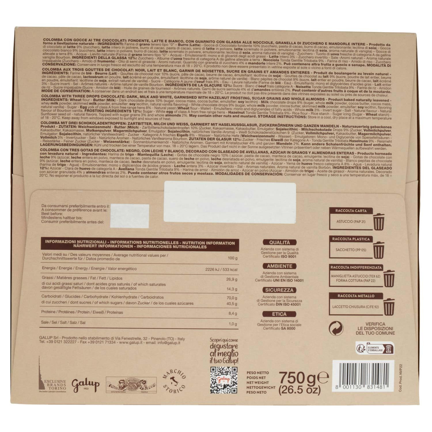 Dettagli: Descrizione prodotto GALUP C.BA TRE CIOCCOL Ingredienti Farina di grano tenero tipo "0" Burro (latte) Gocce di cioccolato fondente 10% (zucchero, pasta di cacao, burro di cacao, emulsionante: lecitina di soia) Gocce di cioccolato al latte 9% (zucchero, latte intero in polvere, burro di cacao, pasta di cacao, siero di latte in polvere, latte scremato in polvere, emulsionante: lecitina di soia, aroma naturale di vaniglia) Gocce di cioccolato bianco 9% (zucchero, latte intero in polvere, burro di cacao, latte scremato in polvere, emulsionante: lecitina di soia, aroma naturale di vaniglia) Zucchero Tuorlo di uova fresche di categoria A da galline allevate a terra 8% Acqua Lievito naturale (farina di grano tenero tipo "0" - acqua) Emulsionanti: mono e di gliceridi degli acidi grassi Latte intero 3% Zucchero invertito Sale Aromi naturali Aroma naturale vaniglia Bourbon Ingredienti della glassa 12%: zucchero - albume d'uova fresche di categoria A da galline allevate a terra - nocciola Tonda Gentile Trilobata 9% - farina di riso - amido di riso - zucchero impalpabile (zucchero - amido di frumento) - olio di semi di girasole - aromi naturali Guarnito con granella di zucchero 4% e mandorle intere 2% Può contenere altra frutta a guscio e senape