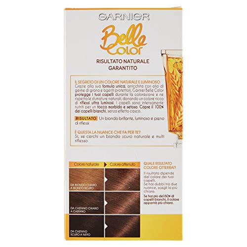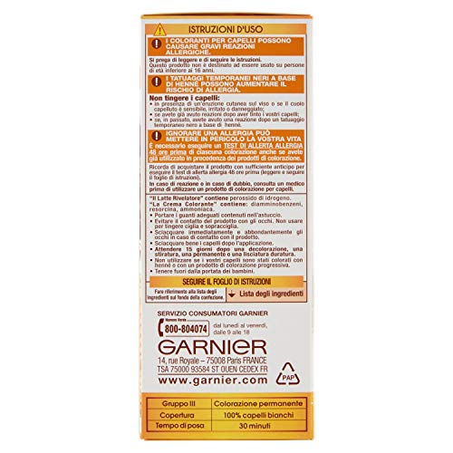 Dettagli: Descrizione Così naturale che non puoi sbagliare. Risultato naturale garantito. A differenza di altre colorazioni, Garnier Belle Color, grazie agli agenti riflessanti, rispetta ed esalta le sfumature naturali dei capelli per un risultato armonioso e un colore luminoso. Ricco di sfumature e senza effetto casco, il colore è così naturale che sembra il tuo! La sua formula in crema color facile si applica come uno shampoo, per una distribuzione facile e uniforme. E con un tempo di posa di soli 20 minuti copre il 100% dei capelli bianchi. Ingredienti Le liste degli ingredienti dei prodotti di L’Oréal Paris vengono regolarmente aggiornate. Ti invitiamo quindi a leggere la lista che trovi sulla confezione del prodotto per assicurarti che gli ingredienti siano adatti al tuo utilizzo personale. Indicazioni Con Belle Color, tingere i capelli è facile e piacevole: 1. Versa la crema colorante nel flacone applicatore e agita bene; 2. Applica la miscela con l’aiuto del flacone applicatore e massaggia per distribuire il prodotto. 3. Lascia agire per 30 minuti e poi risciacqua bene fino a che l’acqua non diventa chiara 4. Usa il trattamento nutritivo in crema all’olio di germe di grano per mantenere i capellisi soffici e setosi. Garnier Belle Color non è destinato ad essere usato su persone di età inferiore ai 16 anni. Eseguire imperativamente il test di allerta allergia 48 ore prima di ciascuna applicazione di questo prodotto, seguendo le istruzioni contenute nel pack. Contenuto della confezione 1 flacone applicatore di latte rivelatore 60 ml 1 tubo di crema colorante 40 g 1 flacone di trattamento nutritivo in crema 40 ml 1 foglio di istruzioni 1 paio di guanti.