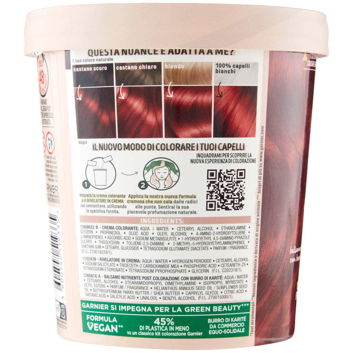 Dettagli: Descrizione GARNIER GOOD COLORAZIONE PERMANENTE SENZA AMMONIACA 6.6 ROSSO MELOGRANO 160 GR. Ingredienti 1268622 b: aqua / water cetearyl alcohol ethanolamine glycerin propanediol oleic acid oleyl alcohol 4-amino-2-hydroxytoluene p-aminophenol ascorbic acid sodium metabisulfite 1-hydroxyethyl 4,5-diamino pyrazole sulfate thioglycerin toluene-2,5-diamine 2-methyl-5-hydroxyethylaminophenol xanthan gum cetearyl glucoside tetrasodium glutamate diacetate parfum / fragrance (f.i.l. z70018229/1), 1152439: aqua / water hydrogen peroxide cetearyl alcohol sodium salicylate trideceth-2 carboxamide mea phosphoric acid ceteareth-25 tetrasodium etidronate tetrasodium pyrophosphate glycerin (f.i.l. c202318/1), 1265616 a: aqua / water cetearyl alcohol stearamidopropyl dimethylamine isopropyl myristate cetyl esters parfum / fragrance helianthus annuus seed oil / sunflower seed oil butyrospermum parkii butter / shea butter caprylyl glycol citric acid tartaric acid salicylic acid linalool benzyl alcohol (f.i.l. z70015000/1). Avviso di sicurezza tenere lontano dai bambini