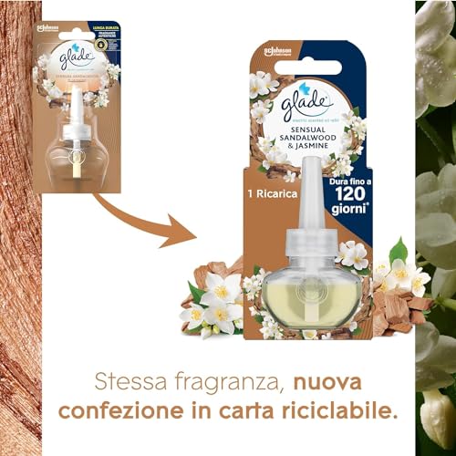 Dettagli: Descrizione Crea un'atmosfera accogliente in ogni stanza con il profumatore per ambienti Glade liquidi elettrico. La Fragranza Sensual Sandalwood & Jasmine riempie la stanza con note di petali di gelsomino, sandalo cremoso e muschio. La fragranza è realizzata da maestri profumieri e infusa con oli essenziali. Ingredienti Le liste degli ingredienti dei prodotti SC Johnson vengono regolarmente aggiornate. Ti invitiamo quindi a leggere la lista che trovi sulla confezione del prodotto oppure a visitare il sito https://www.whatsinsidescjohnson.com/it/it
