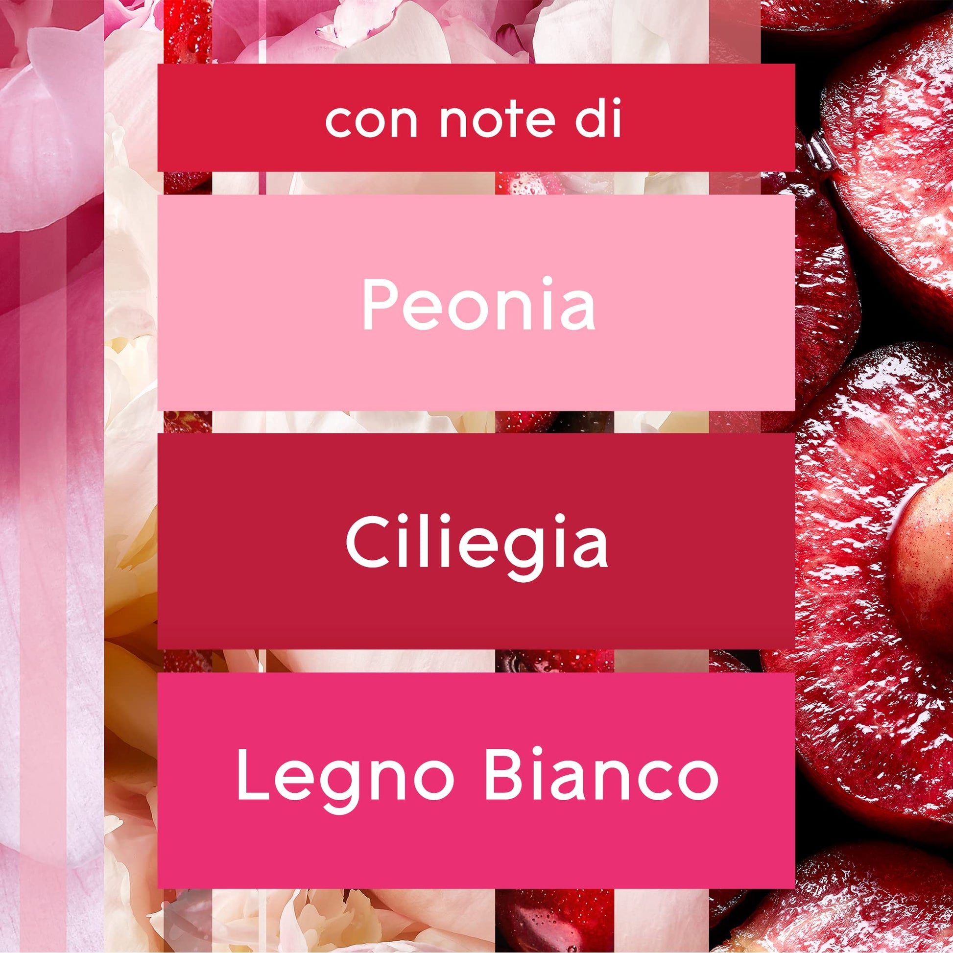 - Le note luminose e speziate della ciliegia e dei frutti rossi flirtano con le note affascinanti e delicate delle rose rosa e della preziosa peonia; i profumi rilassanti del legno bianco e del muschio cremoso le mettono in risalto, conferendo romanticismo all’ambiente
