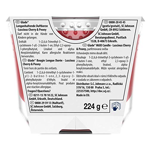 - Contenuto della confezione: candela profumata Glade in vetro, I Love You – ringraziamento (fiori e note di frutta), confezione da 1 (1 x 224 g).